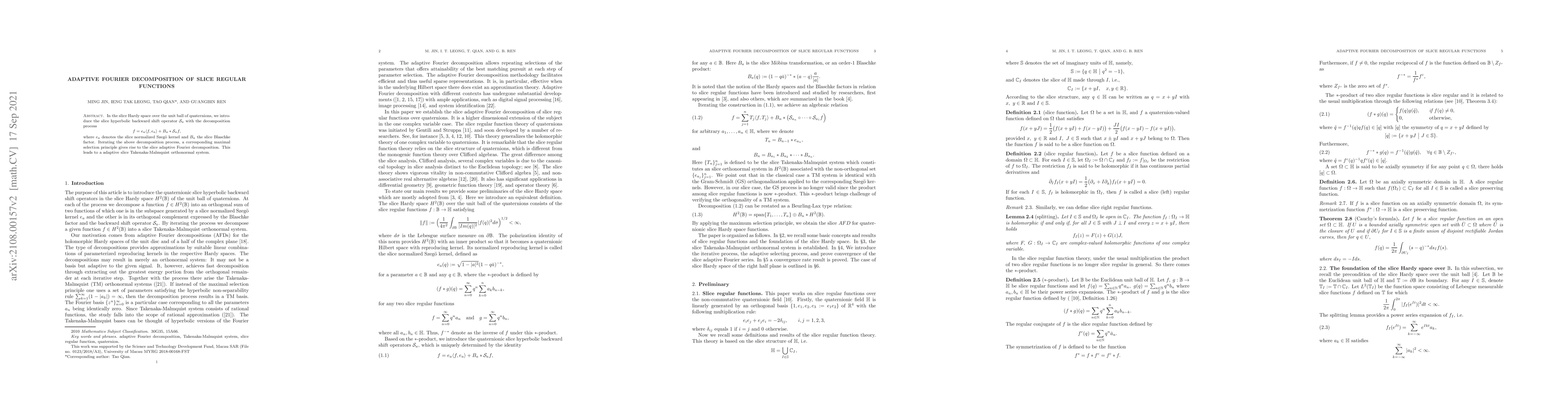 In the slice Hardy space over the unit ball of quaternions, we introduce the slice hyperbolic backward shift operator $\mathcal S_a$ with the decomposition process $$f=e_a\langle f, e_a\rangle+B_{a}*\mathcal S_a f,$$ where $e_a$ denotes the slice normalized Szeg\"o kernel and $ B_a $ the slice Blaschke factor. Iterating the above decomposition process, a corresponding maximal selection principle gives rise to the slice adaptive Fourier decomposition. This leads to a adaptive slice Takenaka-Malmquist orthonormal system.