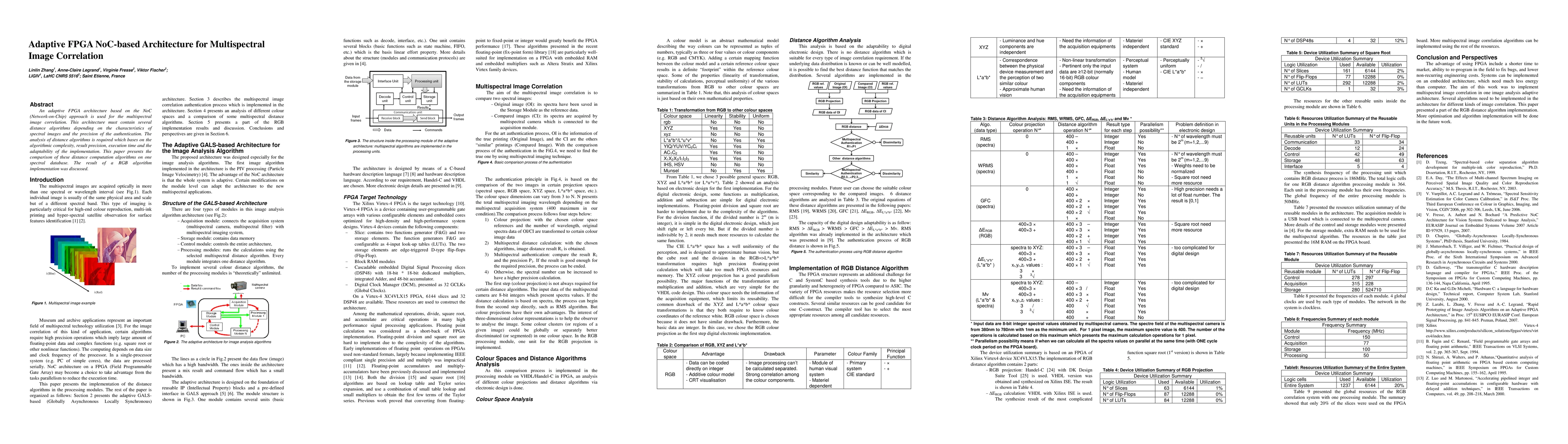 This paper proposes an adaptive FPGA architecture using a NoC approach for multispectral image correlation, comparing various distance algorithms based on complexity, precision, execution time, and adaptability. The study concludes with a discussion on the implementation and results of an RGB algorithm on a spectral database.