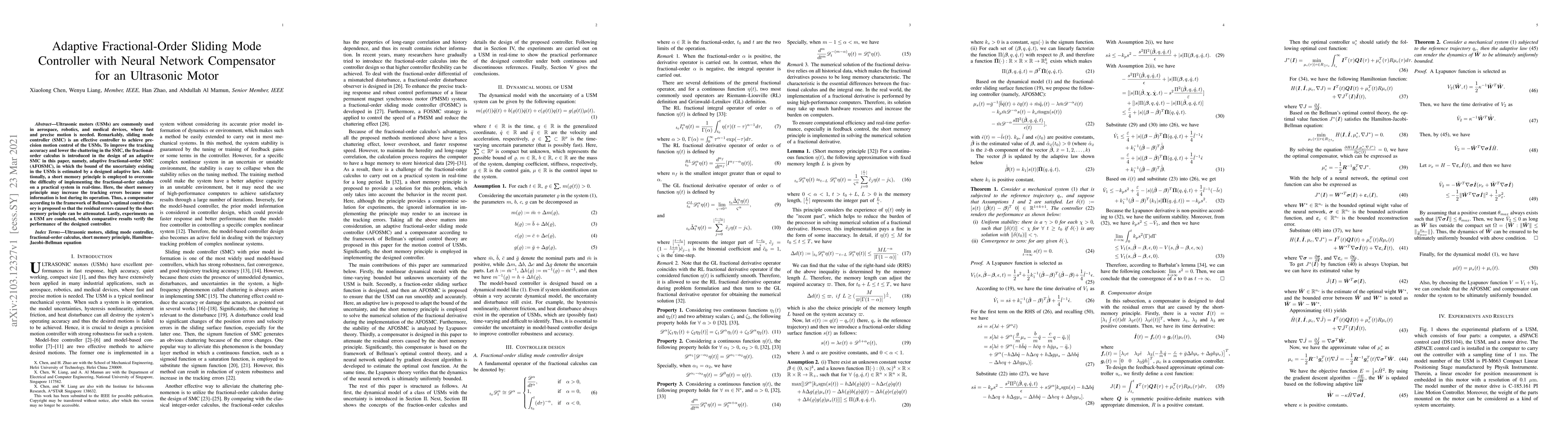 Ultrasonic motors (USMs) are commonly used in aerospace, robotics, and medical devices, where fast and precise motion is needed. Remarkably, sliding mode controller (SMC) is an effective controller to achieve precision motion control of the USMs. To improve the tracking accuracy and lower the chattering in the SMC, the fractional-order calculus is introduced in the design of an adaptive SMC in this paper, namely, adaptive fractional-order SMC (AFOSMC), in which the bound of the uncertainty existing in the USMs is estimated by a designed adaptive law. Additionally, a short memory principle is employed to overcome the difficulty of implementing the fractional-order calculus on a practical system in real-time. Here, the short memory principle may increase the tracking errors because some information is lost during its operation. Thus, a compensator according to the framework of Bellman's optimal control theory is proposed so that the residual errors caused by the short memory principle can be attenuated. Lastly, experiments on a USM are conducted, which comparative results verify the performance of the designed controller.