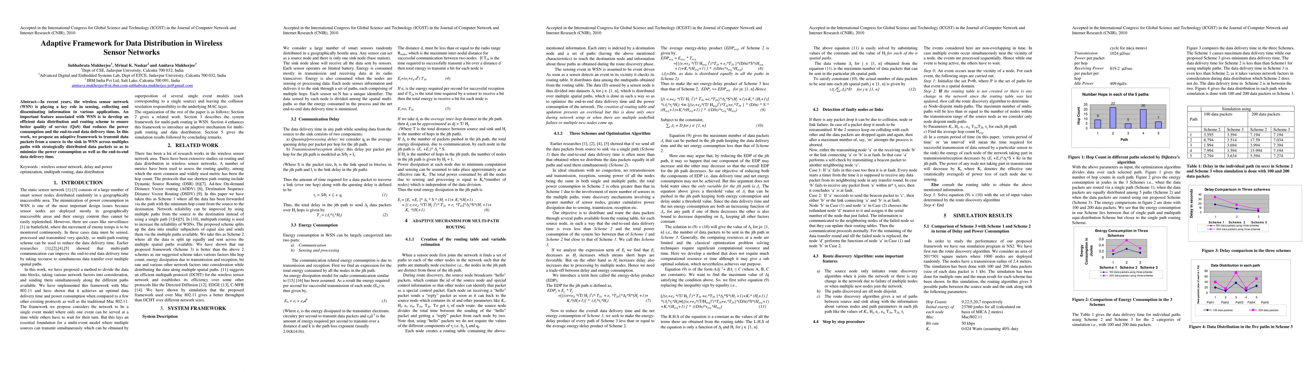 This paper proposes an adaptive framework for efficient data distribution in wireless sensor networks (WSN) to optimize power consumption and reduce data delivery time by strategically distributing data packets across multiple paths. The framework aims to enhance the overall quality of service in WSN applications.