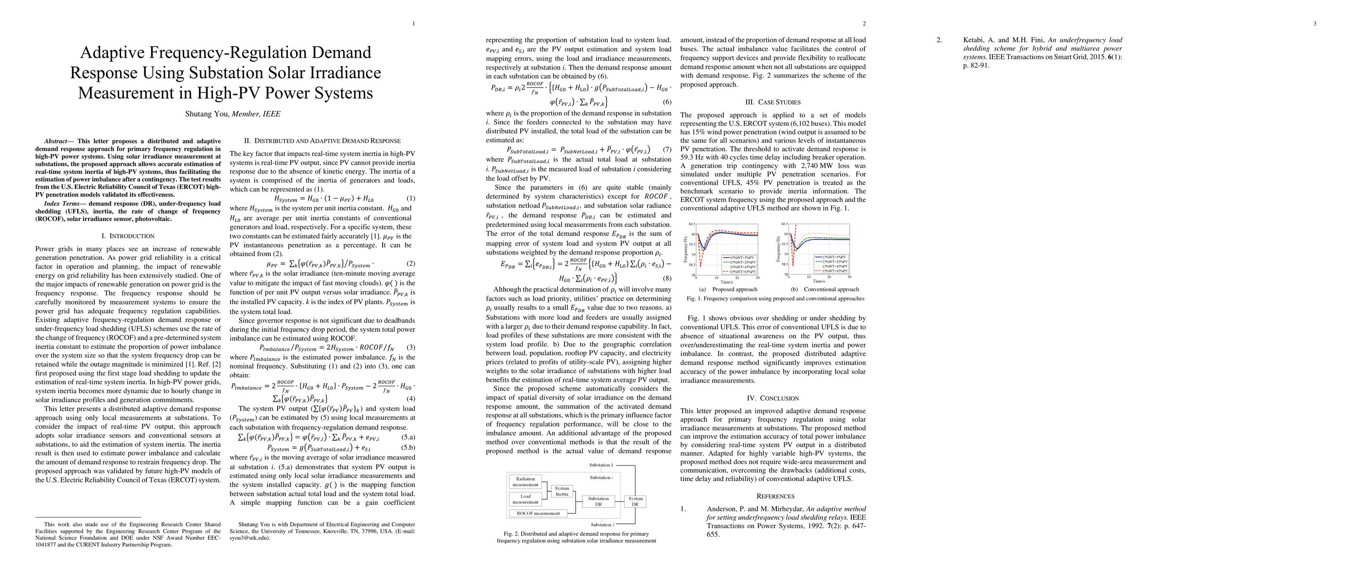 This letter proposes a distributed and adaptive demand response approach for primary frequency regulation in high-PV power systems. Using solar irradiance measurement at substations, the proposed approach allows accurate estimation of real-time system inertia of high-PV systems, thus facilitating the estimation of power imbalance after a contingency. The test results from the U.S. Electric Reliability Council of Texas (ERCOT) high-PV penetration models validated its effectiveness.