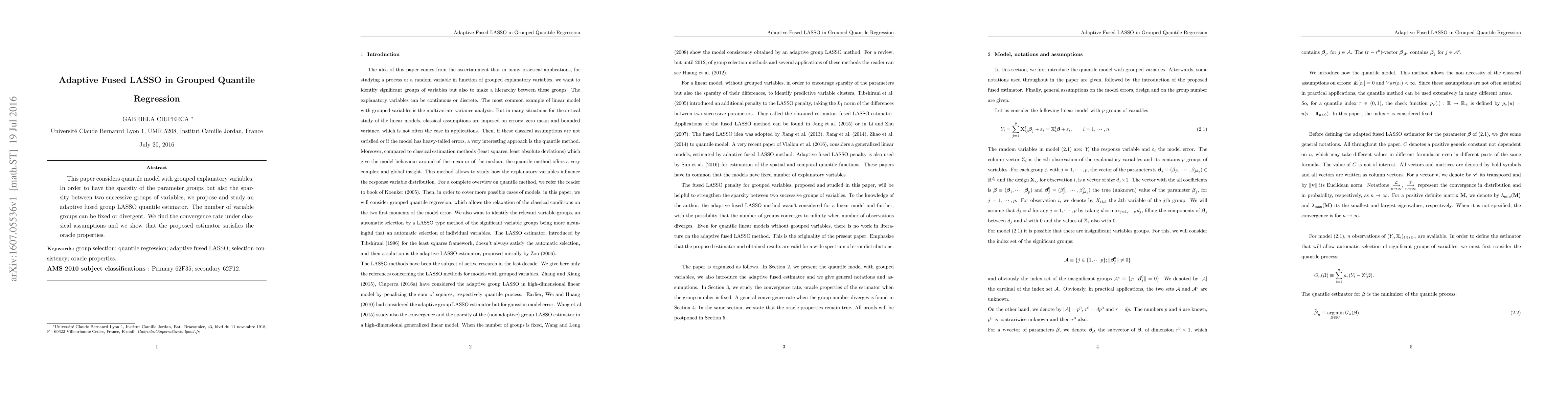 This paper proposes an adaptive fused group LASSO quantile estimator for grouped explanatory variables, achieving sparsity within and between variable groups. The authors demonstrate convergence rate and oracle properties under classical assumptions.
