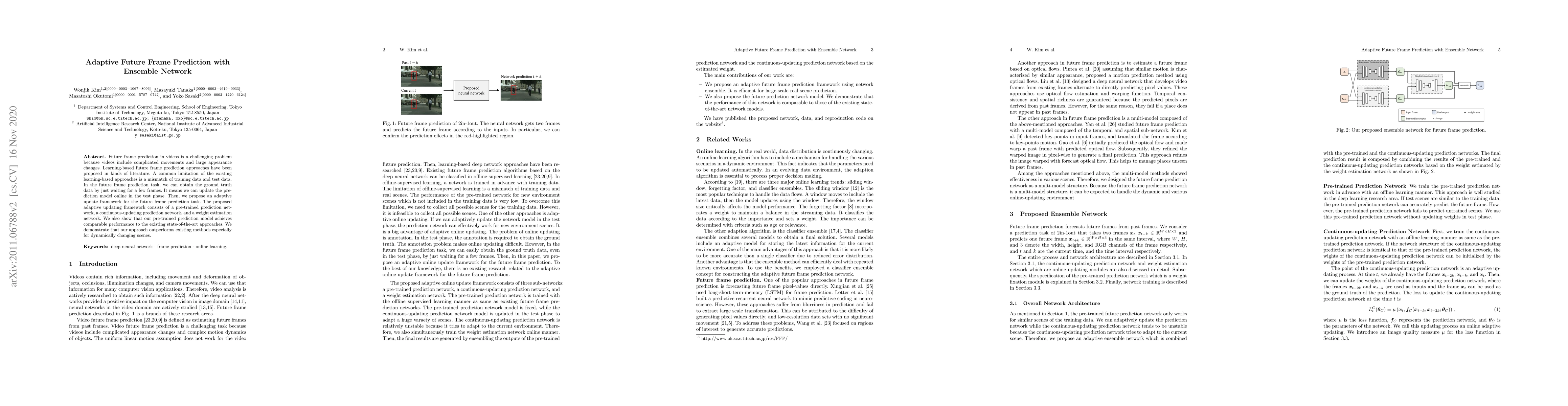This paper proposes an adaptive update framework for future frame prediction in videos, utilizing a pre-trained network, a continuously updating network, and a weight estimation network to improve performance in dynamically changing scenes. The method shows comparable performance to state-of-the-art approaches and outperforms them in scenarios with significant motion and appearance changes.
