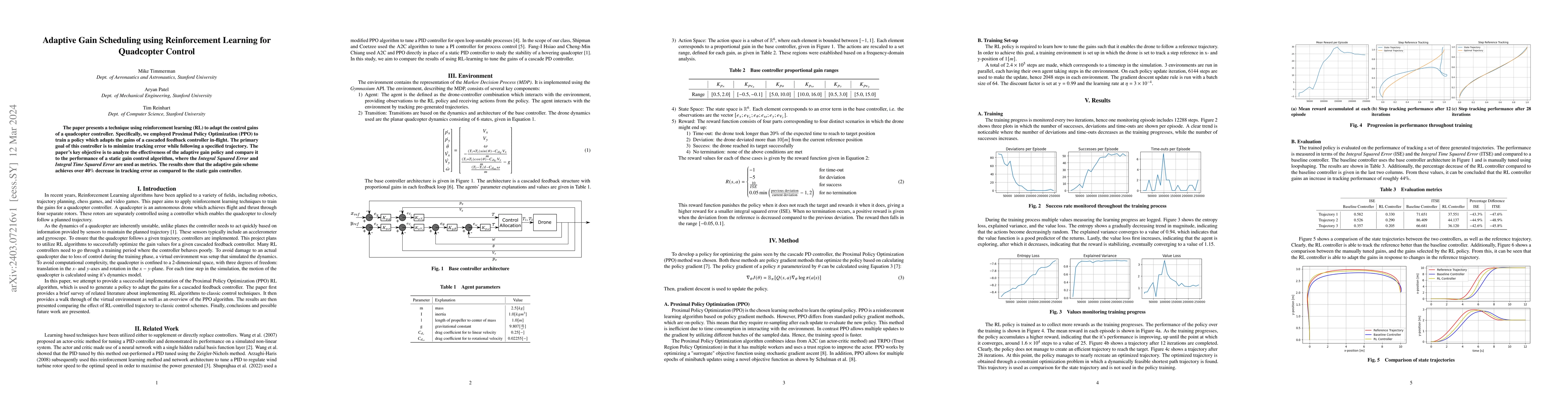 This paper uses reinforcement learning, specifically Proximal Policy Optimization, to dynamically adjust quadcopter control gains, achieving a 40% reduction in tracking error compared to static gain control, demonstrating improved performance.