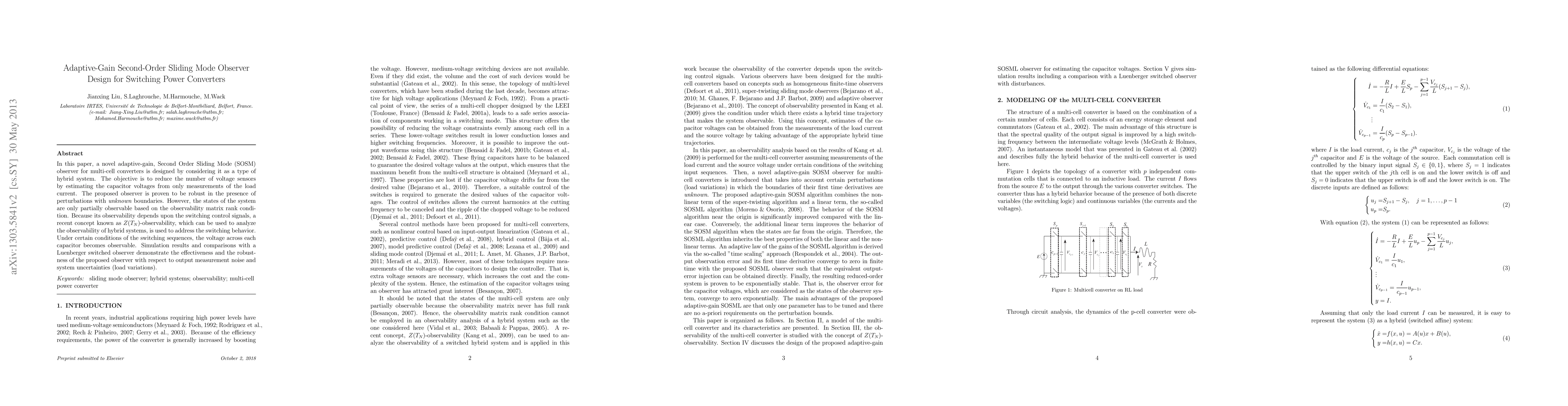 This paper proposes an adaptive-gain Second Order Sliding Mode observer for multicell converters, designed to estimate capacitor voltages from load current measurements, reducing the need for voltage sensors. The observer is shown to be robust against unknown perturbations and utilizes $Z(T_N)$ observability to handle its hybrid nature due to switching behavior.