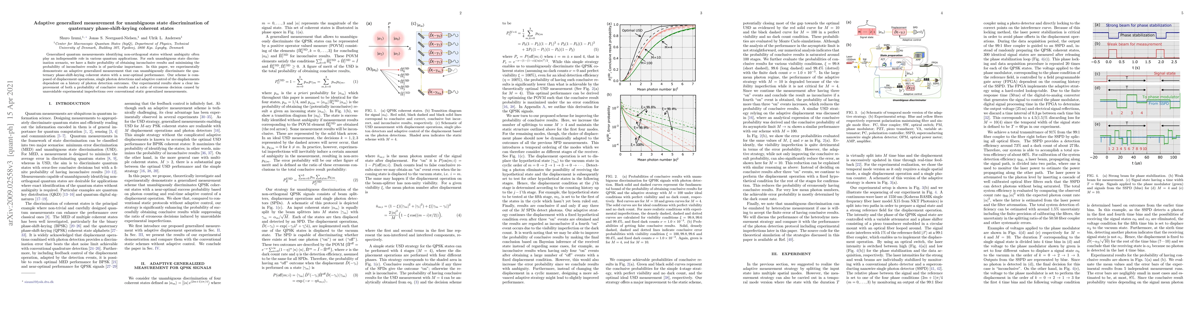 This paper presents an adaptive generalized measurement technique for unambiguous discrimination of non-orthogonal quaternary phase-shift-keying coherent states, achieving near-optimal performance through displacement operations and adaptive control based on photon detection outcomes. Experimental results show improved conclusive results and reduced error rates compared to conventional static methods.