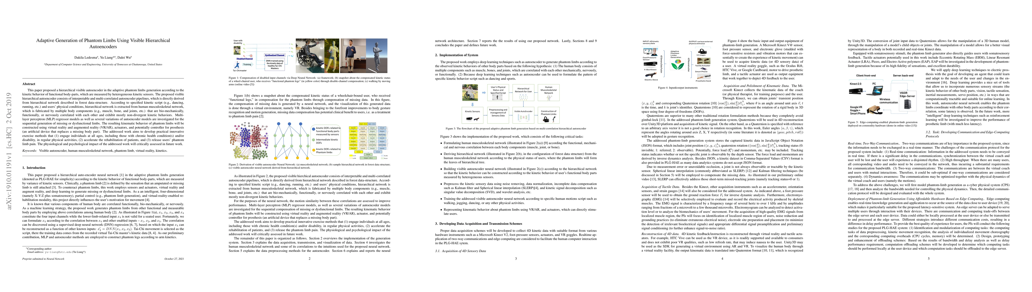 This paper proposed a hierarchical visible autoencoder in the adaptive phantom limbs generation according to the kinetic behavior of functional body-parts, which are measured by heterogeneous kinetic sensors. The proposed visible hierarchical autoencoder consists of interpretable and multi-correlated autoencoder pipelines, which is directly derived from the hierarchical network described in forest data-structure. According to specified kinetic script (e.g., dancing, running, etc.) and users' physical conditions, hierarchical network is extracted from human musculoskeletal network, which is fabricated by multiple body components (e.g., muscle, bone, and joints, etc.) that are bio-mechanically, functionally, or nervously correlated with each other and exhibit mostly non-divergent kinetic behaviors. Multi-layer perceptron (MLP) regressor models, as well as several variations of autoencoder models, are investigated for the sequential generation of missing or dysfunctional limbs. The resulting kinematic behavior of phantom limbs will be constructed using virtual reality and augmented reality (VR/AR), actuators, and potentially controller for a prosthesis (an artificial device that replaces a missing body part). The addressed work aims to develop practical innovative exercise methods that (1) engage individuals at all ages, including those with a chronic health condition(s) and/or disability, in regular physical activities, (2) accelerate the rehabilitation of patients, and (3) release users' phantom limb pain. The physiological and psychological impact of the addressed work will critically be assessed in future work.