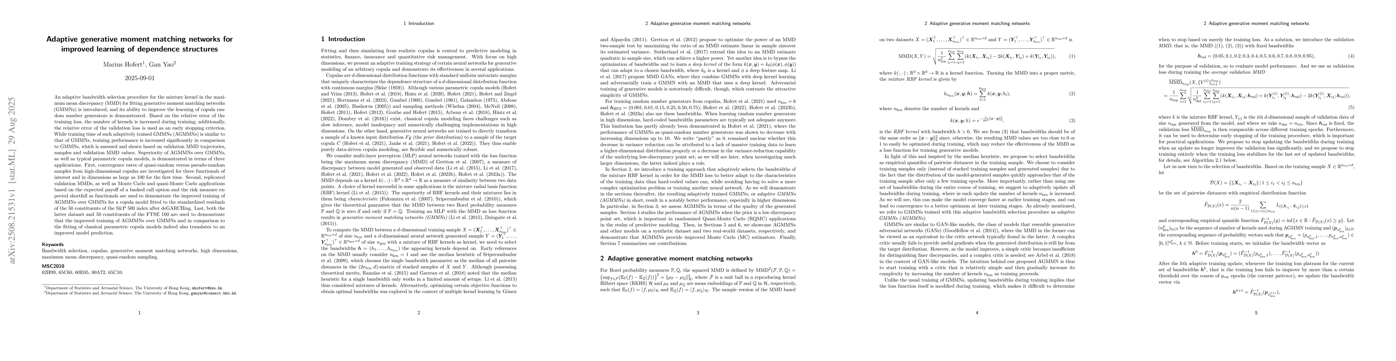An adaptive bandwidth selection procedure for the mixture kernel in the maximum mean discrepancy (MMD) for fitting generative moment matching networks (GMMNs) is introduced, and its ability to improve the learning of copula random number generators is demonstrated. Based on the relative error of the training loss, the number of kernels is increased during training; additionally, the relative error of the validation loss is used as an early stopping criterion. While training time of such adaptively trained GMMNs (AGMMNs) is similar to that of GMMNs, training performance is increased significantly in comparison to GMMNs, which is assessed and shown based on validation MMD trajectories, samples and validation MMD values. Superiority of AGMMNs over GMMNs, as well as typical parametric copula models, is demonstrated in terms of three applications. First, convergence rates of quasi-random versus pseudo-random samples from high-dimensional copulas are investigated for three functionals of interest and in dimensions as large as 100 for the first time. Second, replicated validation MMDs, as well as Monte Carlo and quasi-Monte Carlo applications based on the expected payoff of a basked call option and the risk measure expected shortfall as functionals are used to demonstrate the improved training of AGMMNs over GMMNs for a copula model fitted to the standardized residuals of the 50 constituents of the S&P 500 index after deGARCHing. Last, both the latter dataset and 50 constituents of the FTSE~100 are used to demonstrate that the improved training of AGMMNs over GMMNs and in comparison to the fitting of classical parametric copula models indeed also translates to an improved model prediction.