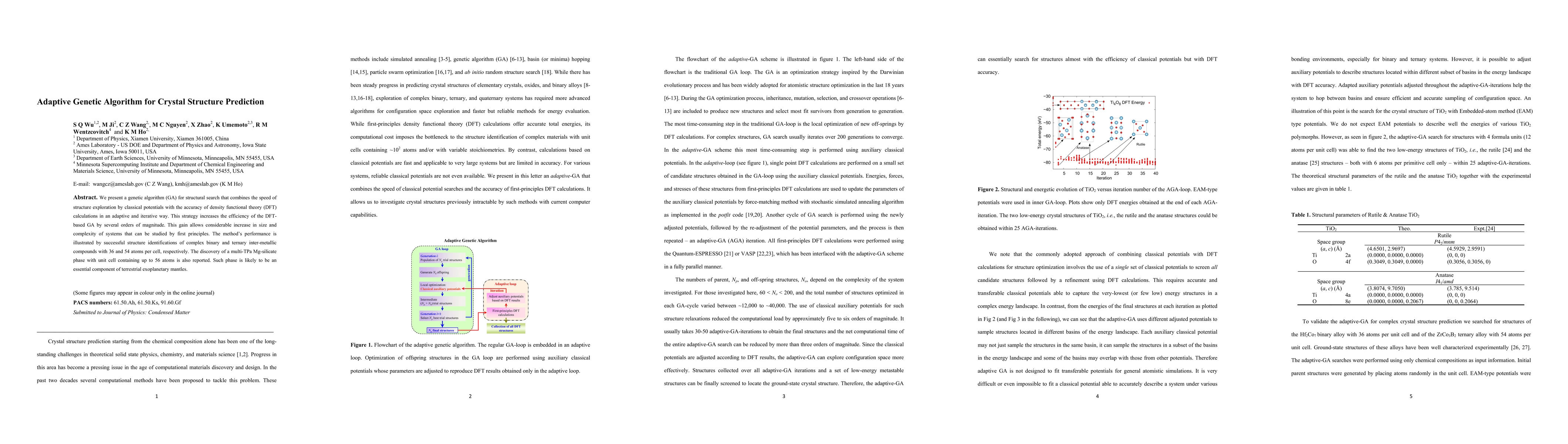 This paper introduces an adaptive genetic algorithm that enhances crystal structure prediction by combining classical potentials with density functional theory, significantly improving efficiency and enabling the study of larger, more complex systems. The method successfully identifies complex inter-metallic compounds and discovers a high-pressure Mg-silicate phase potentially vital for exoplanetary mantles.