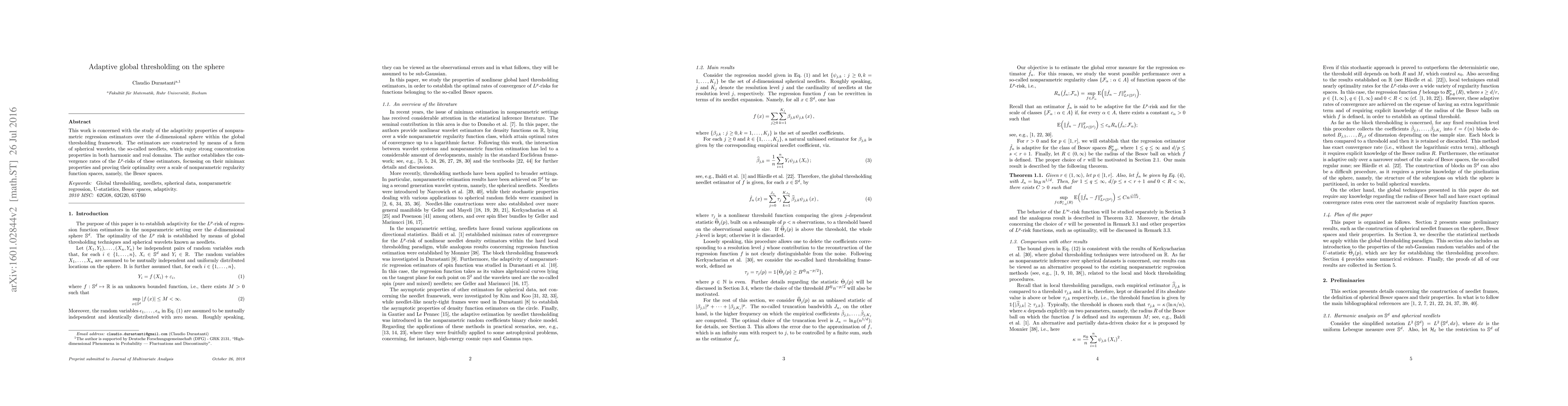 This research paper investigates adaptive global thresholding on the sphere, using needlet-based nonparametric regression estimators. It proves their optimal minimax properties and convergence rates within Besov spaces, showcasing strong concentration properties in harmonic and real domains.