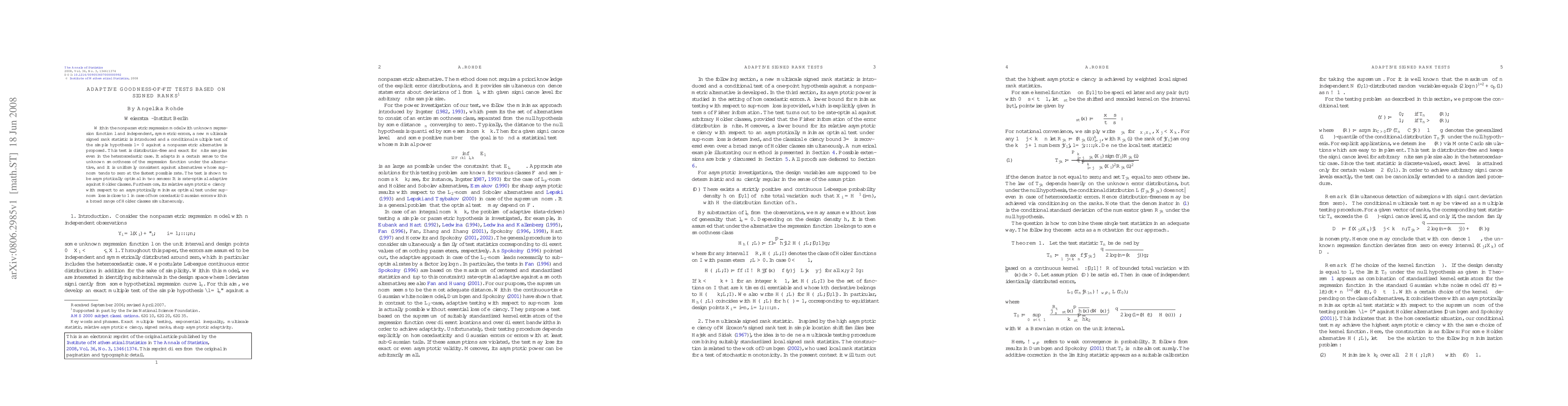 This research introduces a new adaptive goodness-of-fit test based on signed ranks for nonparametric regression models with unknown regression functions and symmetric errors. The test is distribution-free, exact for finite samples, and adapts to unknown smoothness of the regression function, showing rate-optimality and high relative efficiency compared to minimax optimal tests under certain conditions.