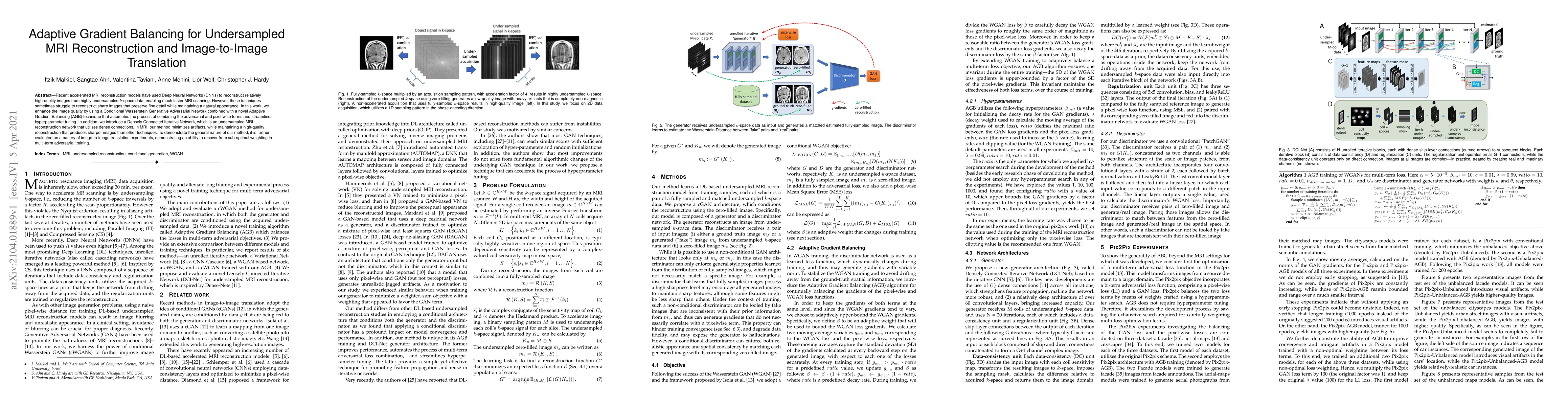 This paper proposes an adaptive gradient balancing technique for enhancing MRI reconstruction from undersampled data using a Conditional Wasserstein Generative Adversarial Network, along with a Densely Connected Iterative Network to minimize artifacts and produce sharper images. The method is also evaluated for its effectiveness in various image-to-image translation tasks.