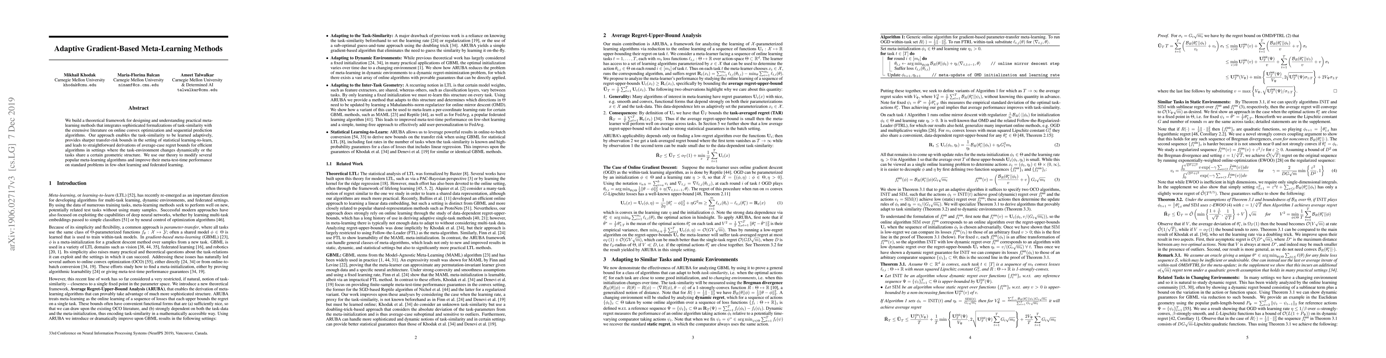 We build a theoretical framework for designing and understanding practical meta-learning methods that integrates sophisticated formalizations of task-similarity with the extensive literature on online convex optimization and sequential prediction algorithms. Our approach enables the task-similarity to be learned adaptively, provides sharper transfer-risk bounds in the setting of statistical learning-to-learn, and leads to straightforward derivations of average-case regret bounds for efficient algorithms in settings where the task-environment changes dynamically or the tasks share a certain geometric structure. We use our theory to modify several popular meta-learning algorithms and improve their meta-test-time performance on standard problems in few-shot learning and federated learning.