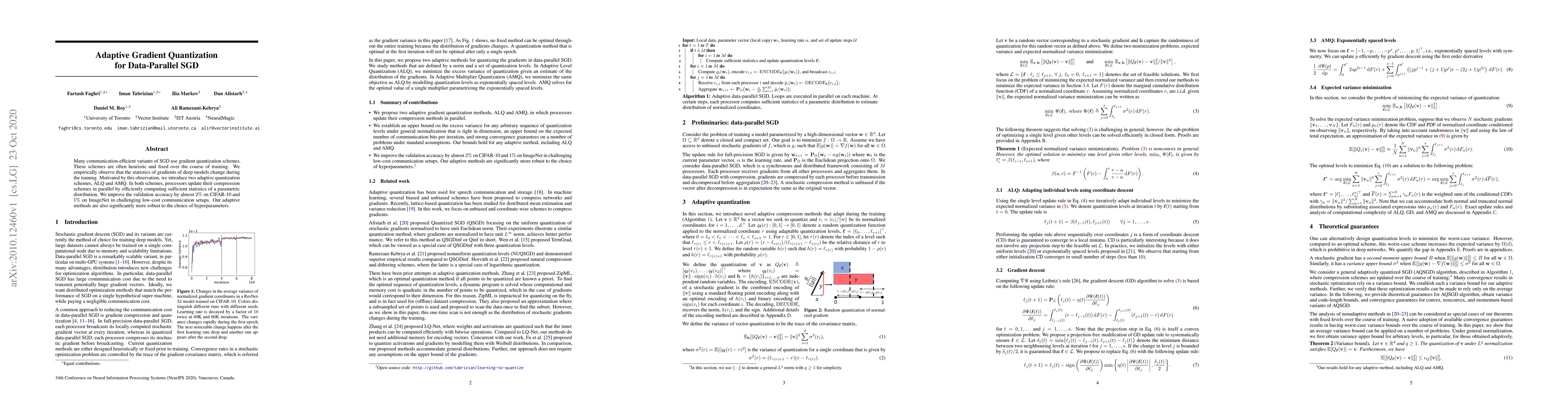 This paper proposes adaptive gradient quantization schemes, ALQ and AMQ, to improve communication efficiency in data-parallel SGD. These methods dynamically adjust the quantization based on gradient statistics, leading to nearly 2% better validation accuracy on CIFAR-10 and 1% on ImageNet, while being more robust to hyperparameters.