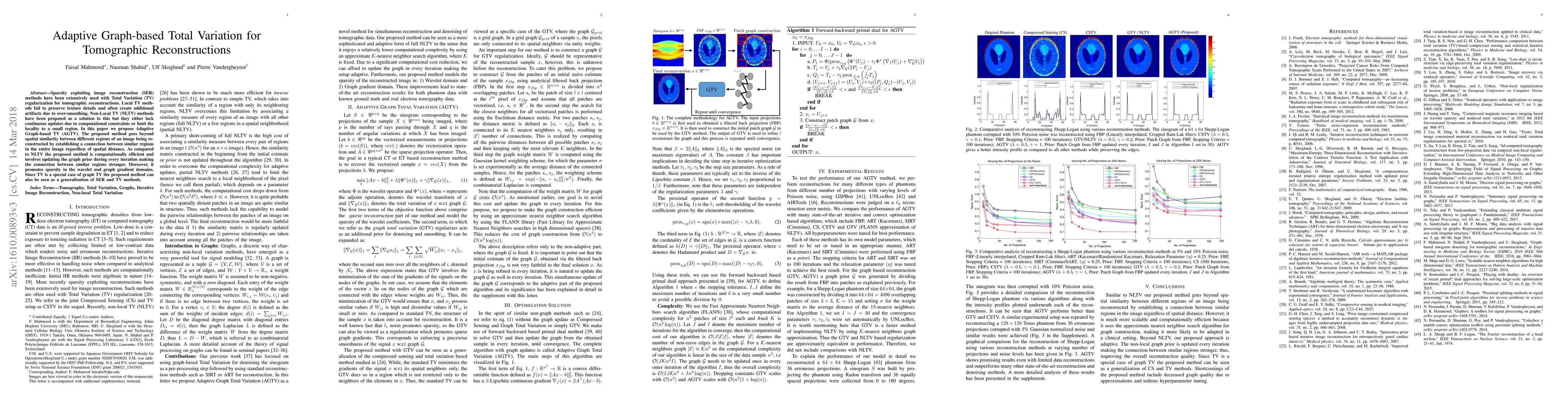 This paper proposes Adaptive Graph-based Total Variation (AGTV) for tomographic reconstructions, which enhances texture detail preservation and reduces artifacts by establishing connections between similar regions across the entire image, offering computational efficiency and continuous graph updates. AGTV generalizes sparsity exploiting reconstruction methods and outperforms Non-Local TV methods.
