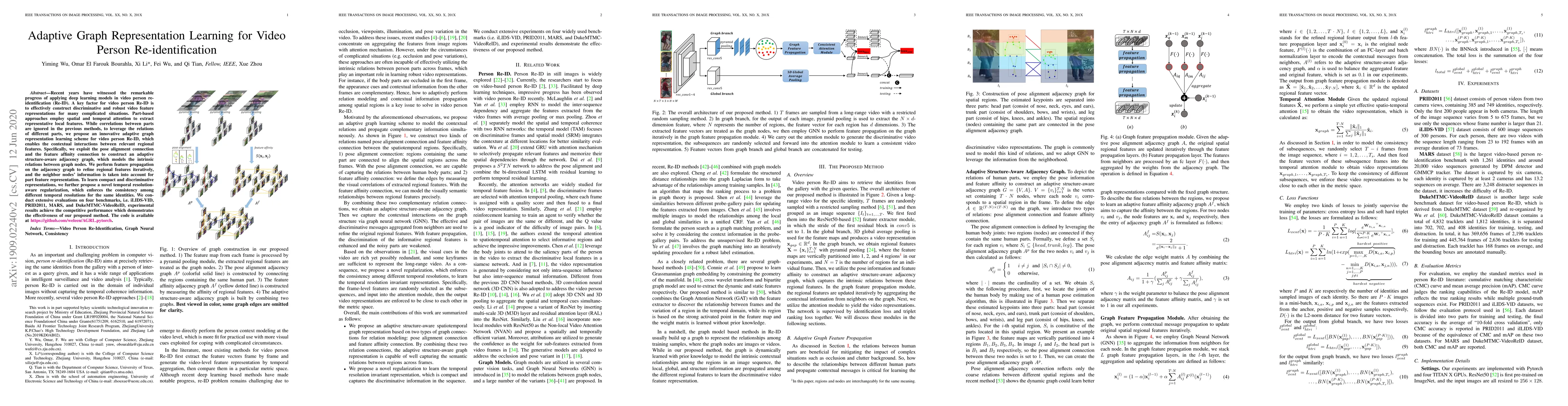 This paper proposes an adaptive graph representation learning scheme to enhance video person re-identification by leveraging contextual interactions between regional features through an adaptive structure-aware adjacency graph. The method refines regional features iteratively and introduces temporal resolution-aware regularization to achieve consistent representations across different temporal resolutions.