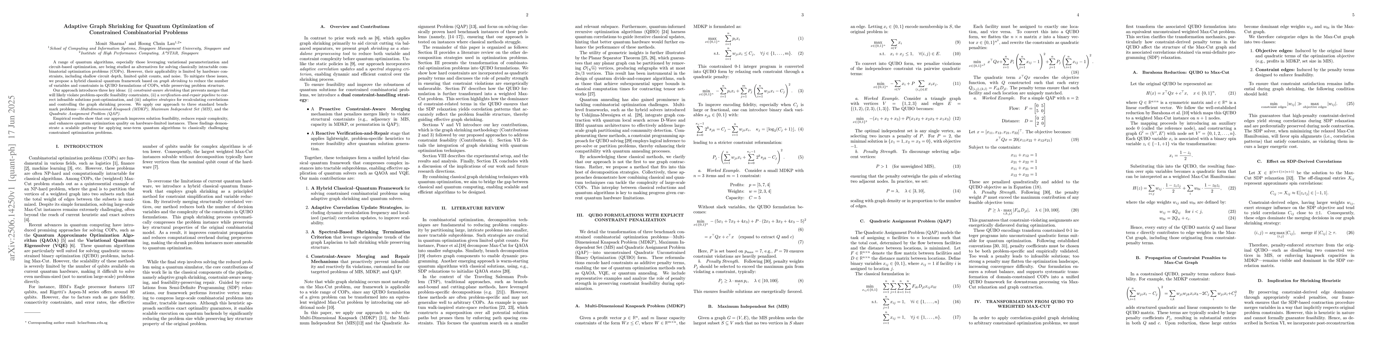 A range of quantum algorithms, especially those leveraging variational parameterization and circuit-based optimization, are being studied as alternatives for solving classically intractable combinatorial optimization problems (COPs). However, their applicability is limited by hardware constraints, including shallow circuit depth, limited qubit counts, and noise. To mitigate these issues, we propose a hybrid classical--quantum framework based on graph shrinking to reduce the number of variables and constraints in QUBO formulations of COPs, while preserving problem structure. Our approach introduces three key ideas: (i) constraint-aware shrinking that prevents merges that will likely violate problem-specific feasibility constraints, (ii) a verification-and-repair pipeline to correct infeasible solutions post-optimization, and (iii) adaptive strategies for recalculating correlations and controlling the graph shrinking process. We apply our approach to three standard benchmark problems: Multidimensional Knapsack (MDKP), Maximum Independent Set (MIS), and the Quadratic Assignment Problem (QAP). Empirical results show that our approach improves solution feasibility, reduces repair complexity, and enhances quantum optimization quality on hardware-limited instances. These findings demonstrate a scalable pathway for applying near-term quantum algorithms to classically challenging constrained optimization problems.