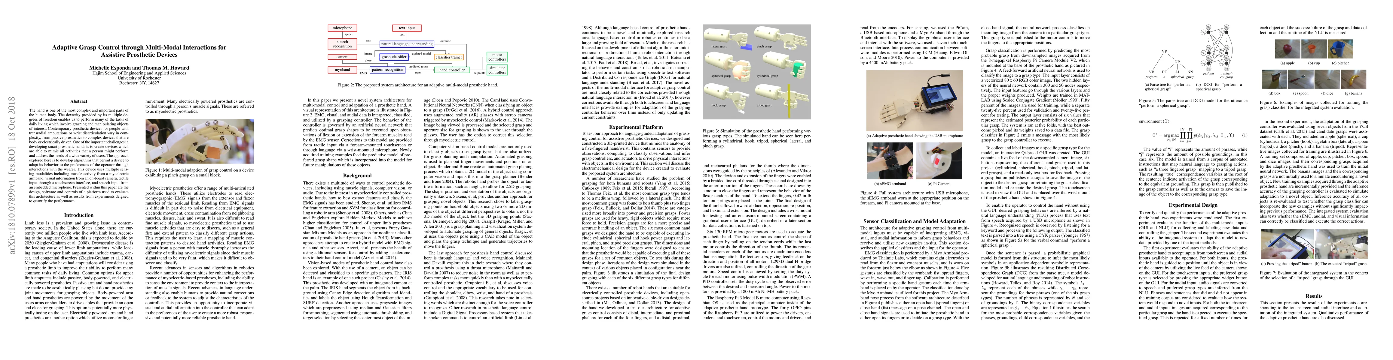 The hand is one of the most complex and important parts of the human body. The dexterity provided by its multiple degrees of freedom enables us to perform many of the tasks of daily living which involve grasping and manipulating objects of interest. Contemporary prosthetic devices for people with transradial amputations or wrist disarticulation vary in complexity, from passive prosthetics to complex devices that are body or electrically driven. One of the important challenges in developing smart prosthetic hands is to create devices which are able to mimic all activities that a person might perform and address the needs of a wide variety of users. The approach explored here is to develop algorithms that permit a device to adapt its behavior to the preferences of the operator through interactions with the wearer. This device uses multiple sensing modalities including muscle activity from a myoelectric armband, visual information from an on-board camera, tactile input through a touchscreen interface, and speech input from an embedded microphone. Presented within this paper are the design, software and controls of a platform used to evaluate this architecture as well as results from experiments deigned to quantify the performance.