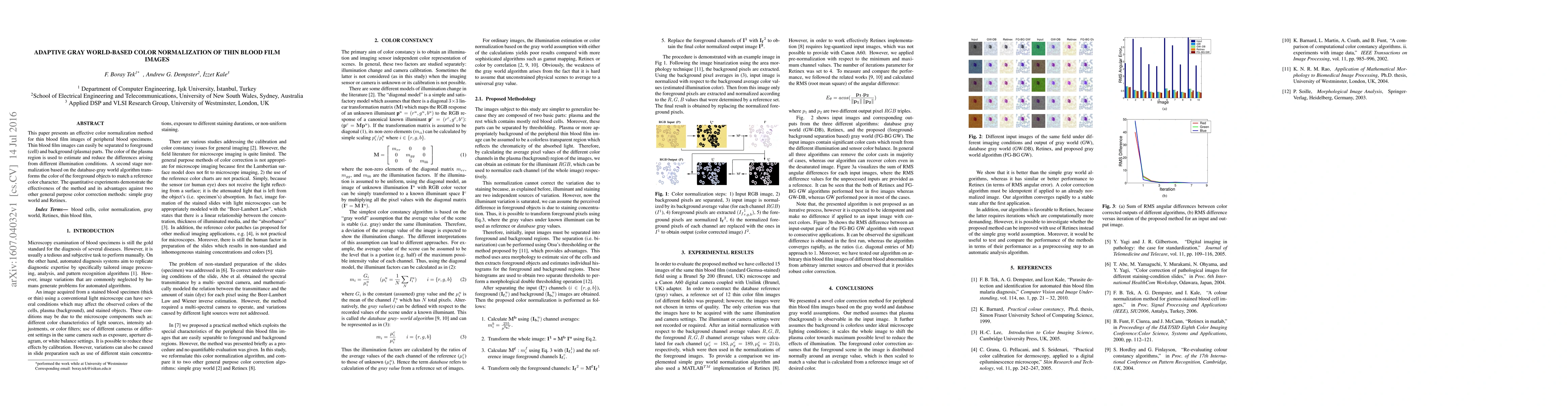 A new color normalization method is proposed for thin blood film images, which separates foreground (cell) and background (plasma), then adjusts the cell colors to match a reference color, improving image quality under varying illumination conditions.