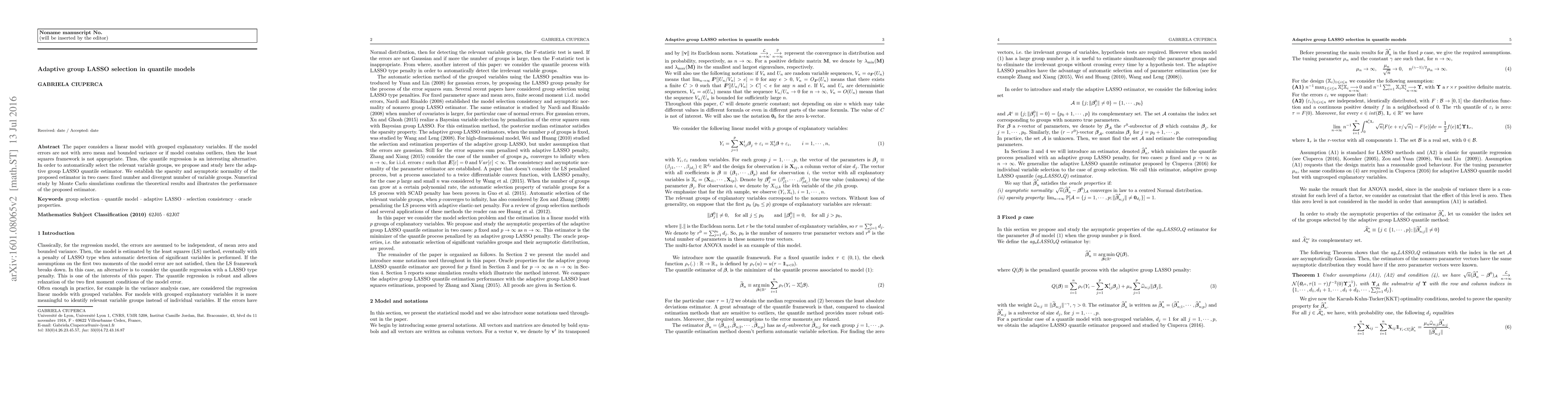 This paper proposes an adaptive group LASSO quantile estimator for linear models with grouped explanatory variables, addressing issues with least squares when errors are non-zero mean or contain outliers. Theoretical results establish the estimator's sparsity and asymptotic normality, validated by Monte Carlo simulations.