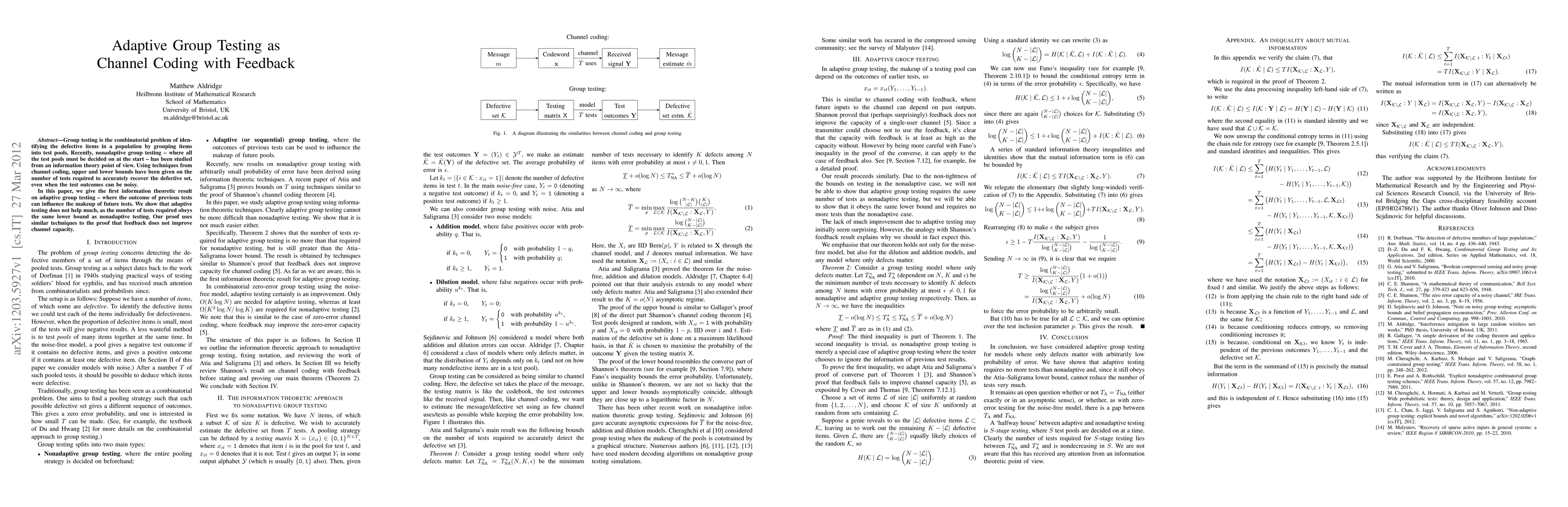 This paper explores adaptive group testing, where test pool decisions can be influenced by previous test results, and finds that adaptive strategies do not significantly reduce the number of tests needed compared to nonadaptive methods. The study uses channel coding techniques to show that adaptive group testing maintains the same lower bounds on test quantity as nonadaptive approaches.