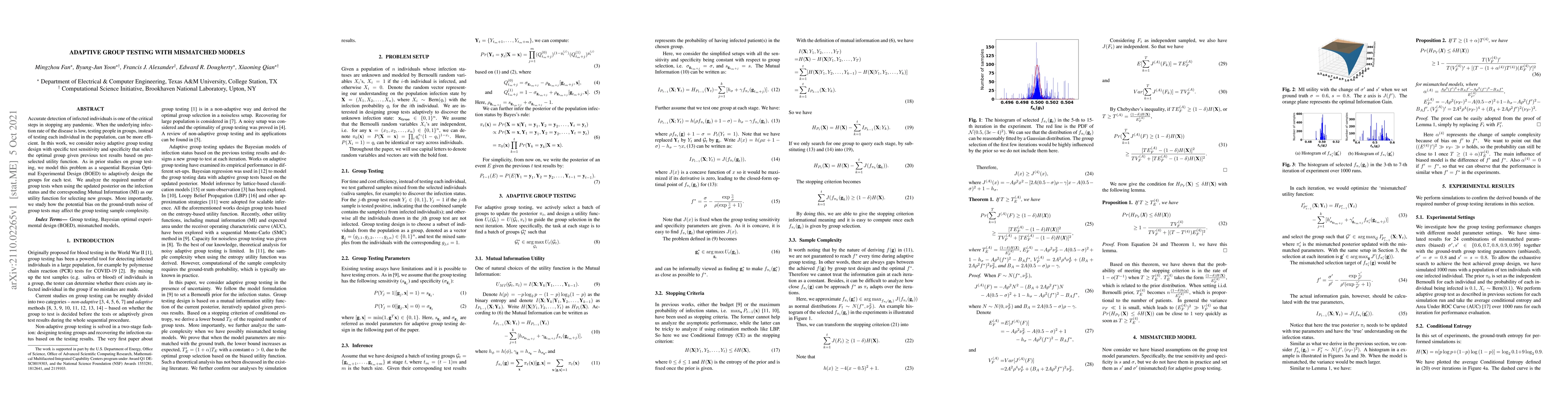 This paper proposes an adaptive group testing method for detecting low-prevalence infections, using Bayesian Optimal Experimental Design to select optimal groups based on previous test results and Mutual Information as a utility function. It examines the impact of noise and bias in group test accuracy on the overall testing efficiency and sample complexity.