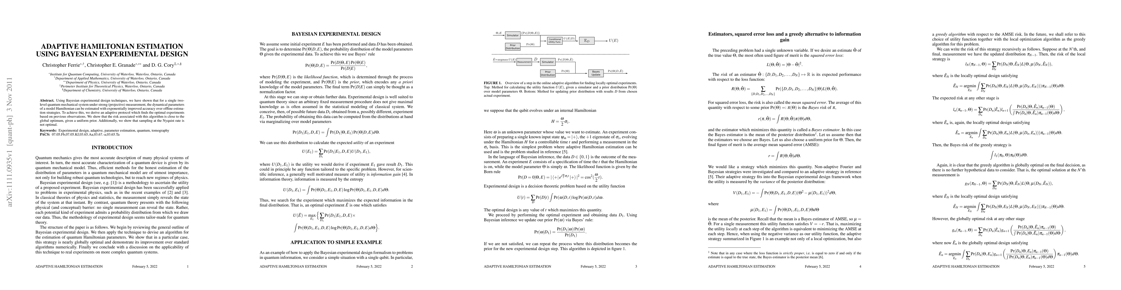 Using Bayesian experimental design techniques, we have shown that for a single two-level quantum mechanical system under strong (projective) measurement, the dynamical parameters of a model Hamiltonian can be estimated with exponentially improved accuracy over offline estimation strategies. To achieve this, we derive an adaptive protocol which finds the optimal experiments based on previous observations. We show that the risk associated with this algorithm is close to the global optimum, given a uniform prior. Additionally, we show that sampling at the Nyquist rate is not optimal.