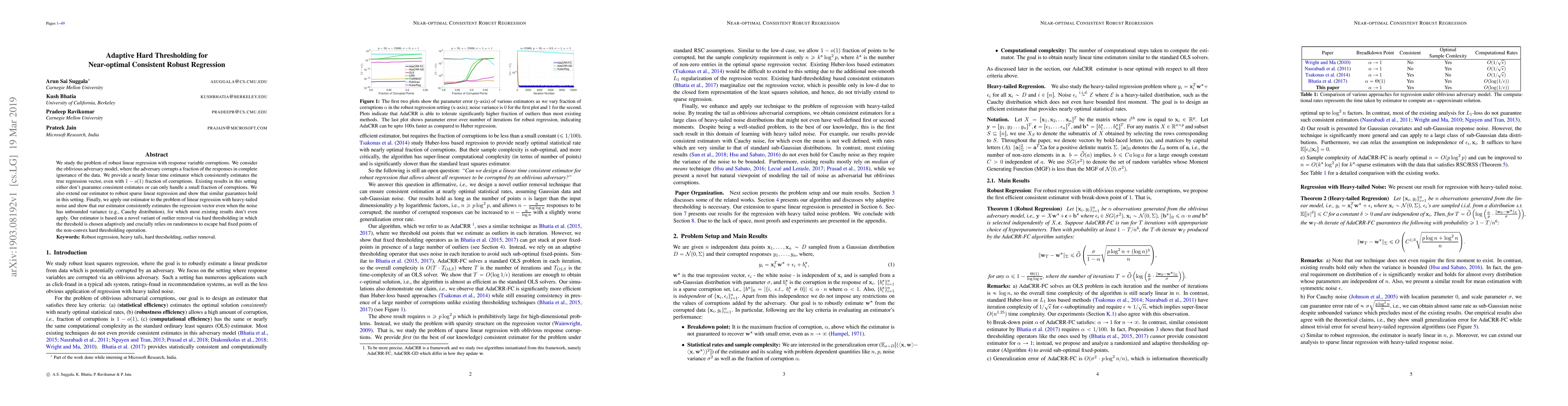 This paper proposes an adaptive hard thresholding method for robust linear regression that can handle a large fraction of response corruptions and heavy-tailed noise. The method consistently estimates the true regression vector even under adversarial corruptions and extends to robust sparse linear regression.