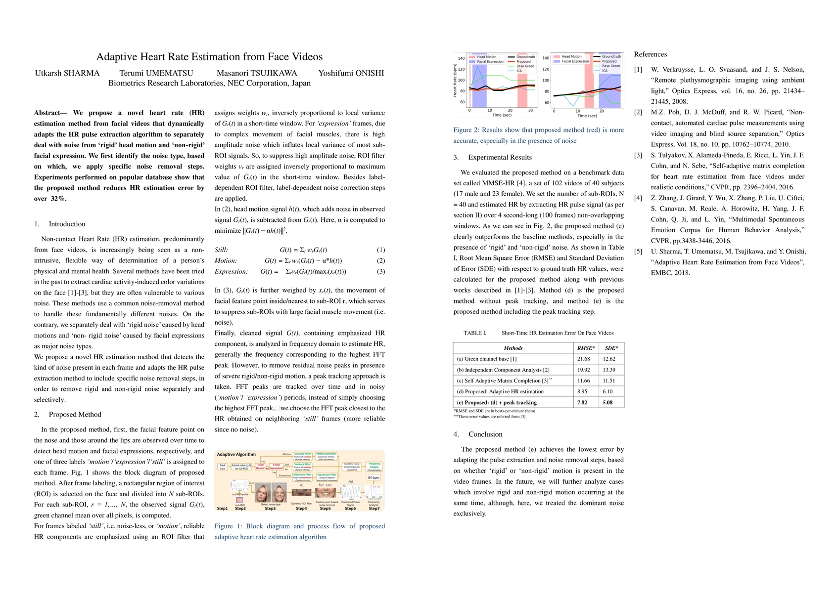 This paper introduces an adaptive heart rate estimation method from facial videos that dynamically adjusts its algorithm to handle noise from head motion and facial expressions. The method reduces heart rate estimation error by over 32% compared to traditional methods, as demonstrated through experiments on a popular database.