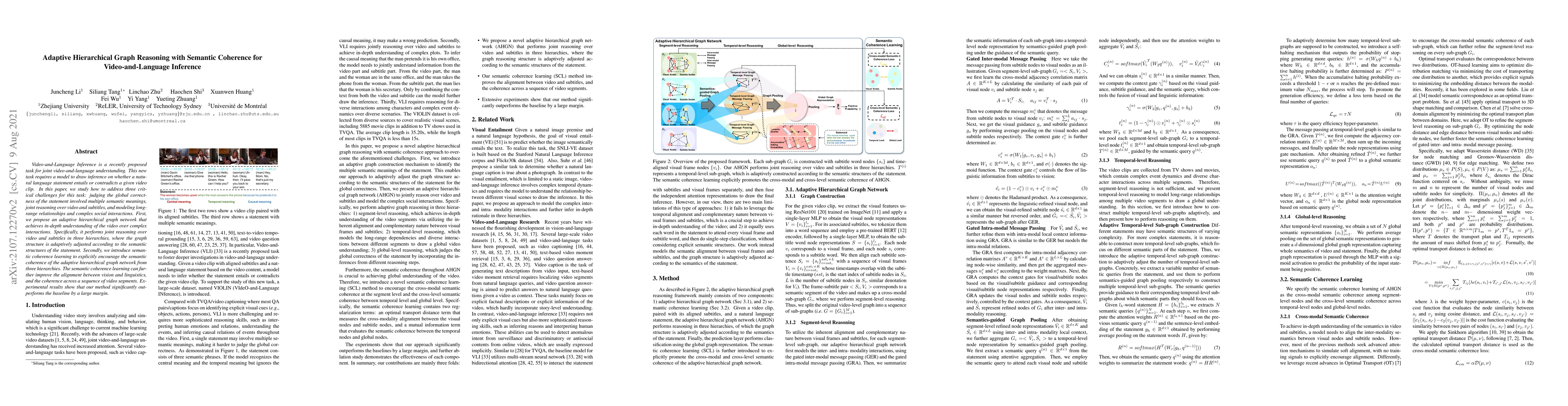 The paper presents an Adaptive Hierarchical Graph Network (AHGN) with Semantic Coherence Learning for Video-and-Language Inference, which models video and language using an adaptive graph structure that aligns with semantic structures of the input statement.