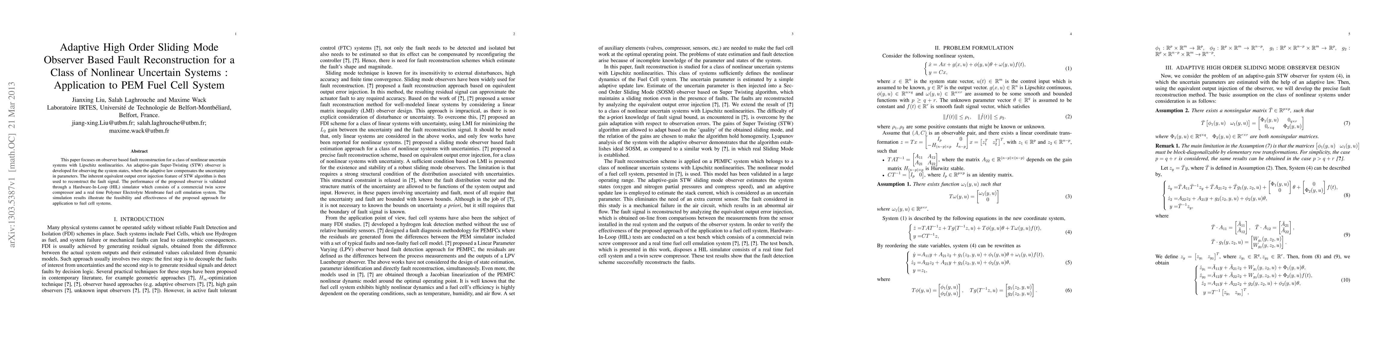 This paper develops an adaptive high-order Super-Twisting observer for fault reconstruction in nonlinear uncertain systems, validated through a Hardware-In-Loop simulator using a PEM fuel cell system. The adaptive gain compensates for parameter uncertainties, and the observer's output error injection reconstructs fault signals effectively.