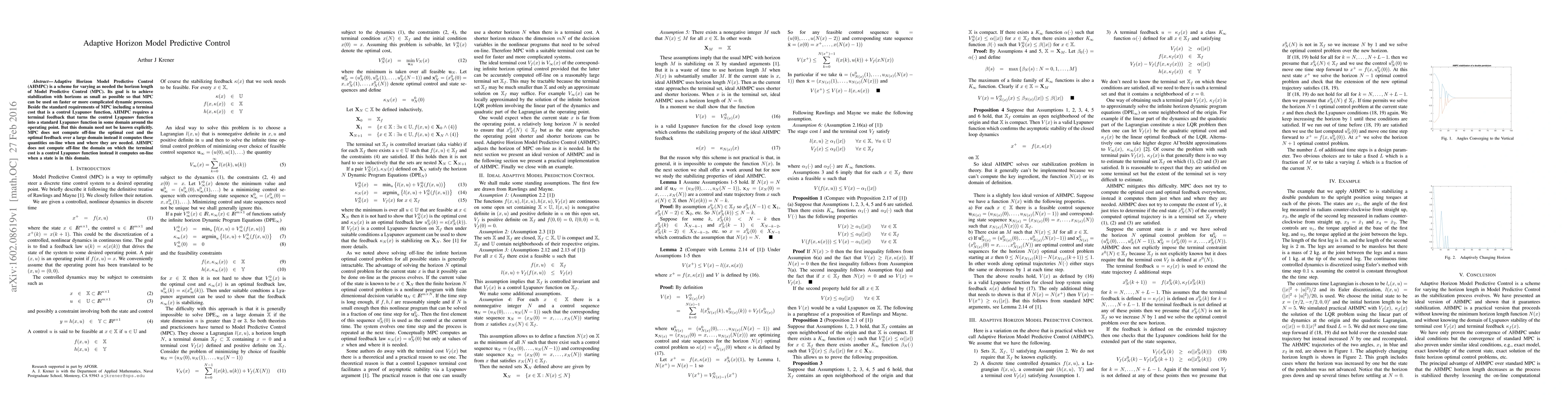 Adaptive Horizon Model Predictive Control (AHMPC) dynamically adjusts the horizon length of Model Predictive Control to stabilize faster or more complex dynamic processes. Unlike traditional MPC, AHMPC computes optimal cost and feedback on-line as needed, without requiring an explicit domain for the control Lyapunov function.