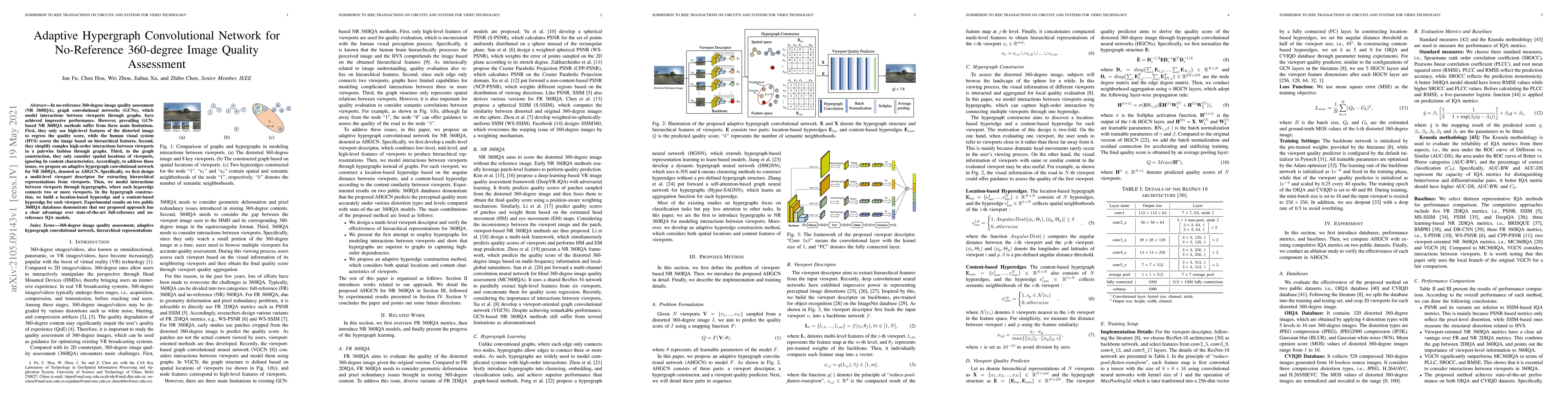 The paper proposes an adaptive hypergraph convolutional network (AHGCN) for no-reference 360-degree image quality assessment, addressing limitations of existing GCN-based methods by incorporating hierarchical features, modeling high-order interactions via hypergraphs, and considering both spatial locations and content characteristics of viewports. Experimental results show superior performance compared to state-of-the-art IQA models.