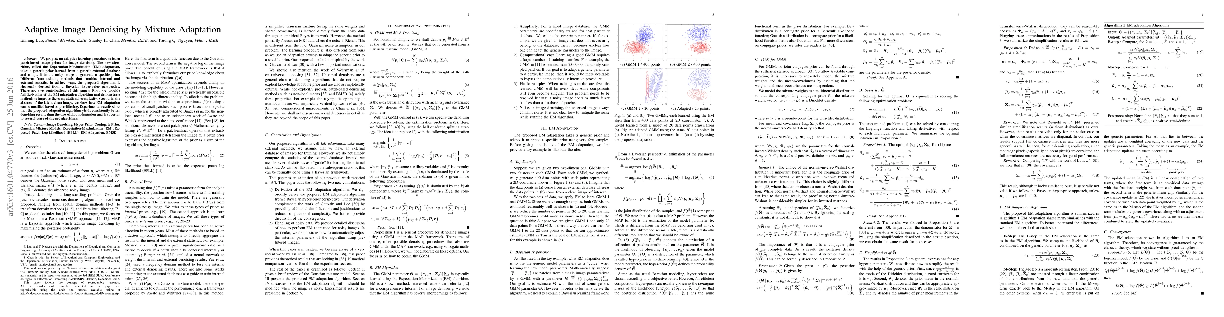 This paper introduces an adaptive learning procedure using Expectation-Maximization (EM) adaptation for patch-based image denoising, rigorously derived from a Bayesian perspective. The proposed method outperforms existing techniques and state-of-the-art algorithms in denoising tasks.