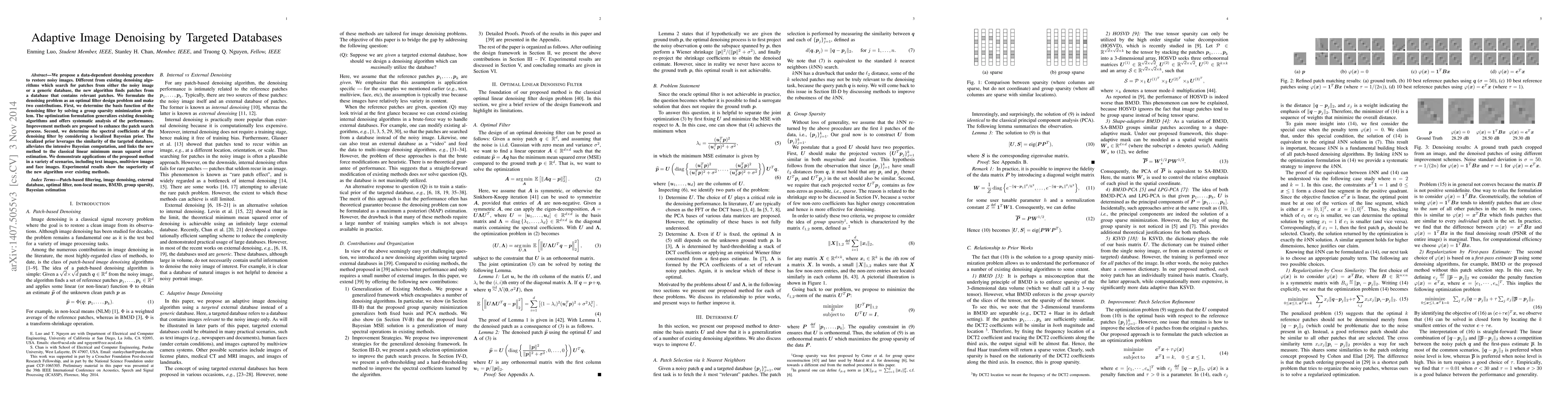 We propose a data-dependent denoising procedure to restore noisy images. Different from existing denoising algorithms which search for patches from either the noisy image or a generic database, the new algorithm finds patches from a database that contains only relevant patches. We formulate the denoising problem as an optimal filter design problem and make two contributions. First, we determine the basis function of the denoising filter by solving a group sparsity minimization problem. The optimization formulation generalizes existing denoising algorithms and offers systematic analysis of the performance. Improvement methods are proposed to enhance the patch search process. Second, we determine the spectral coefficients of the denoising filter by considering a localized Bayesian prior. The localized prior leverages the similarity of the targeted database, alleviates the intensive Bayesian computation, and links the new method to the classical linear minimum mean squared error estimation. We demonstrate applications of the proposed method in a variety of scenarios, including text images, multiview images and face images. Experimental results show the superiority of the new algorithm over existing methods.