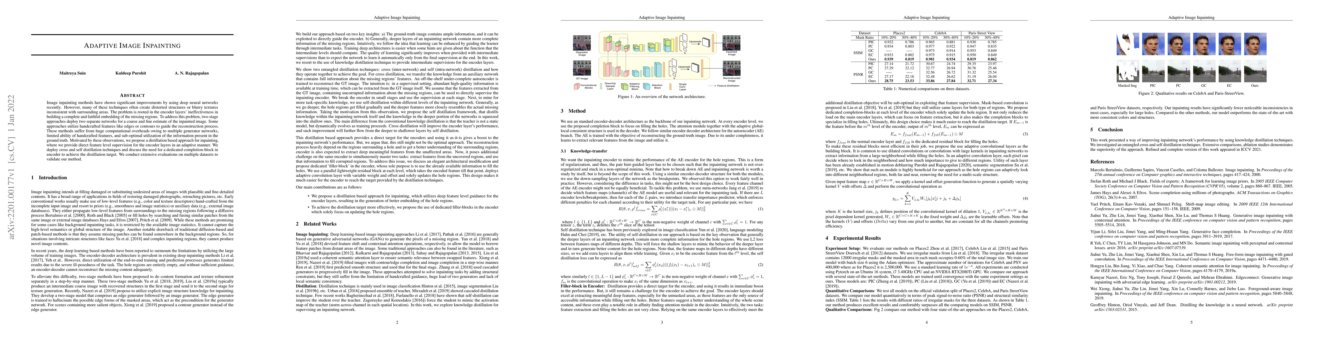 This paper proposes a distillation-based adaptive image inpainting method to improve the fidelity of reconstructed regions by providing direct feature-level supervision to encoder layers. The approach aims to overcome the limitations of existing two-stage methods and handcrafted feature guides, achieving better texture and structural consistency through cross and self-distillation techniques.