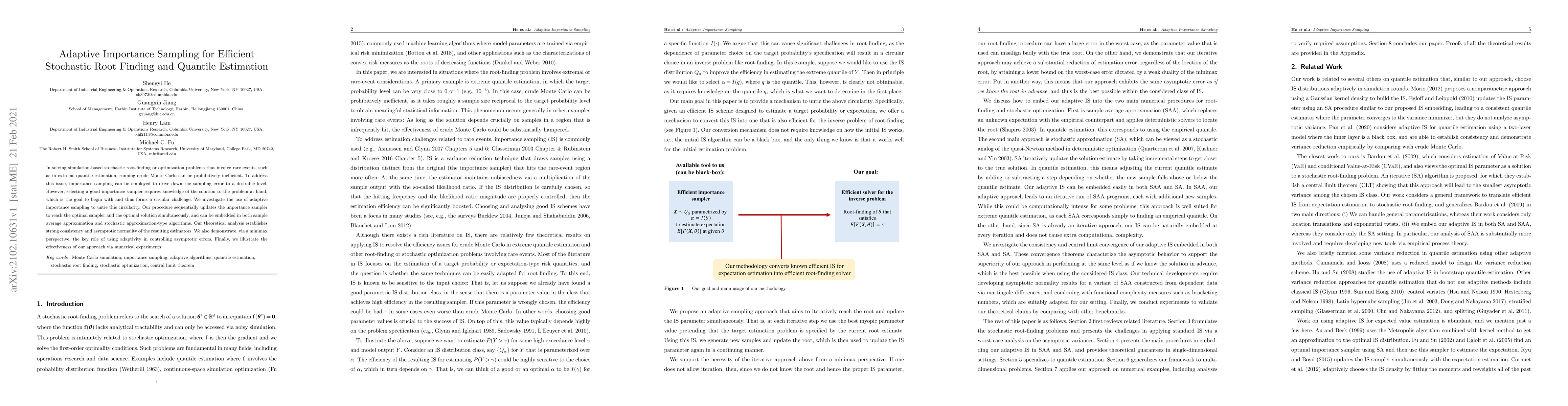This paper proposes adaptive importance sampling to efficiently solve stochastic root-finding and quantile estimation problems involving rare events. The method sequentially updates the importance sampler to achieve optimal performance, demonstrating strong consistency and asymptotic normality through theoretical analysis.