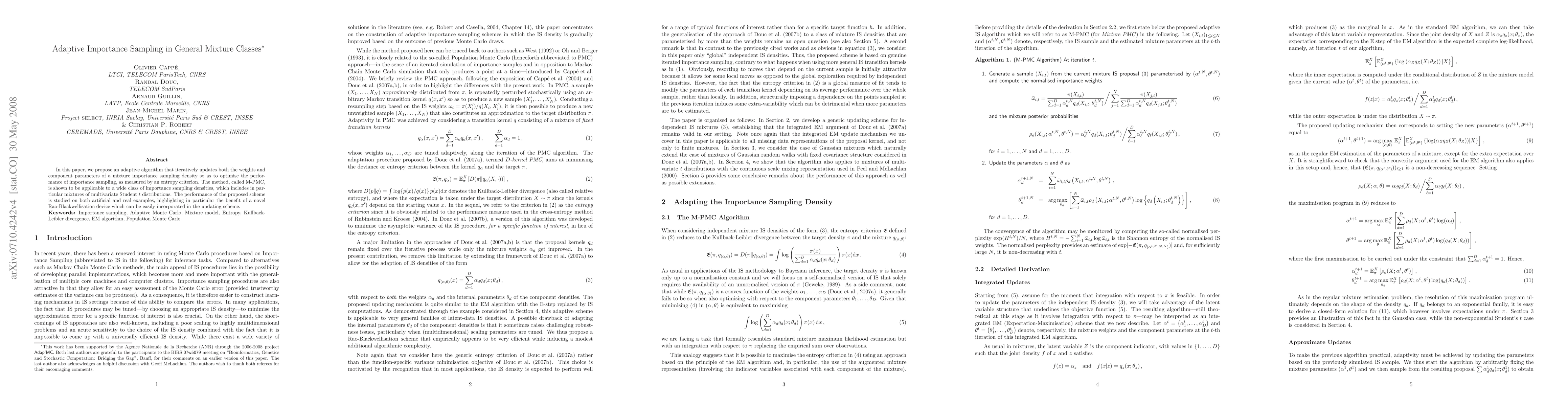 This paper introduces an adaptive algorithm for mixture importance sampling that iteratively updates weights and component parameters to optimize performance based on an entropy criterion. The method is versatile, applicable to various mixture densities, including multivariate Student t distributions, and demonstrates benefits from a novel Rao-Blackwellisation technique.