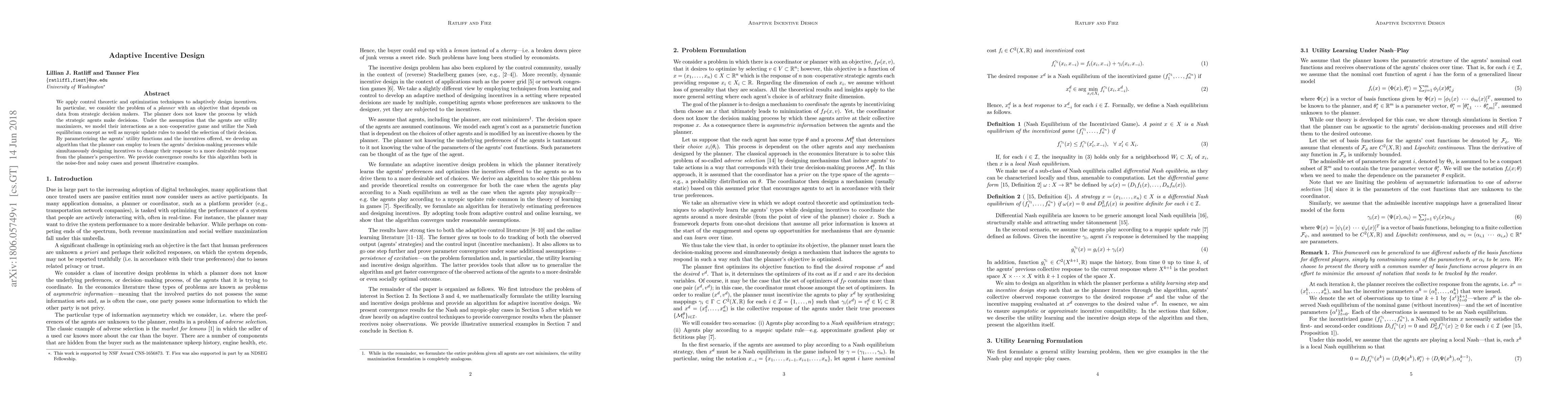 We apply control theoretic and optimization techniques to adaptively design incentives. In particular, we consider the problem of a planner with an objective that depends on data from strategic decision makers. The planner does not know the process by which the strategic agents make decisions. Under the assumption that the agents are utility maximizers, we model their interactions as a non-cooperative game and utilize the Nash equilibrium concept as well as myopic update rules to model the selection of their decision. By parameterizing the agents' utility functions and the incentives offered, we develop an algorithm that the planner can employ to learn the agents' decision-making processes while simultaneously designing incentives to change their response to a more desirable response from the planner's perspective. We provide convergence results for this algorithm both in the noise-free and noisy cases and present illustrative examples.