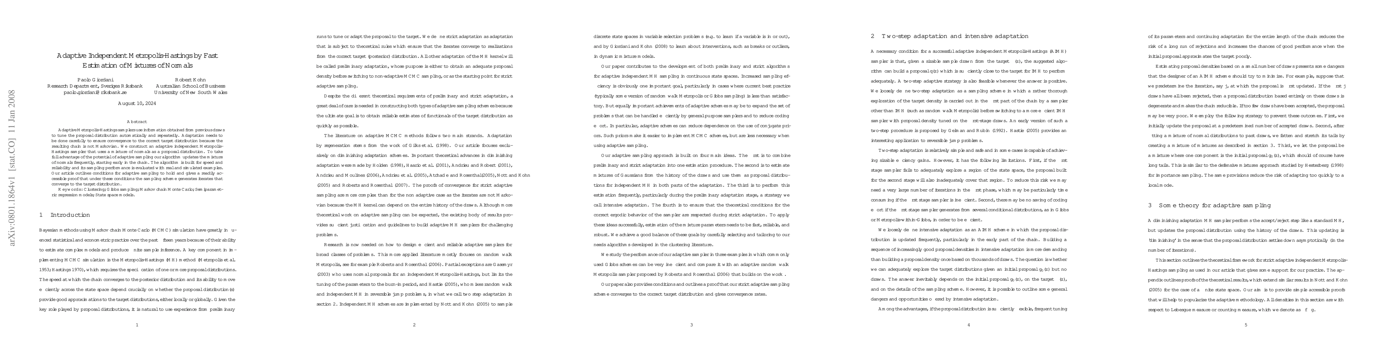 This paper proposes an adaptive independent Metropolis-Hastings algorithm that employs a mixture of normals for proposal distributions, updating them frequently to enhance sampling efficiency. The algorithm's performance is evaluated through real and simulated examples, and it is shown to converge to the target distribution under specified conditions.