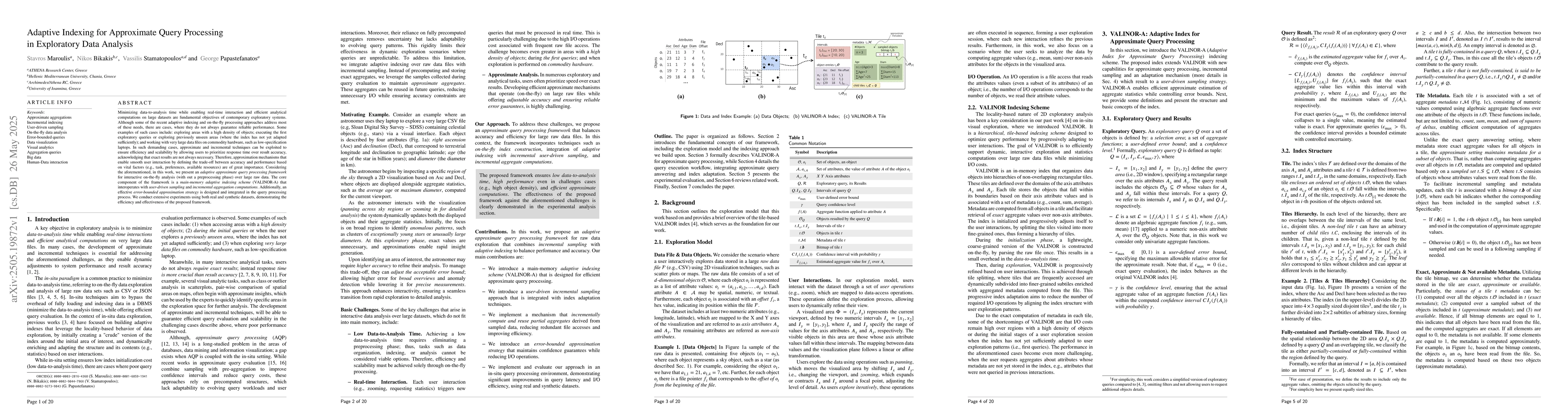 The paper presents an adaptive approximate query processing framework for interactive on-the-fly analysis over large raw data, featuring a main-memory adaptive indexing scheme (VALINOR-A) that interoperates with user-driven sampling and incremental aggregation computations, along with an error-bounded approximation strategy.