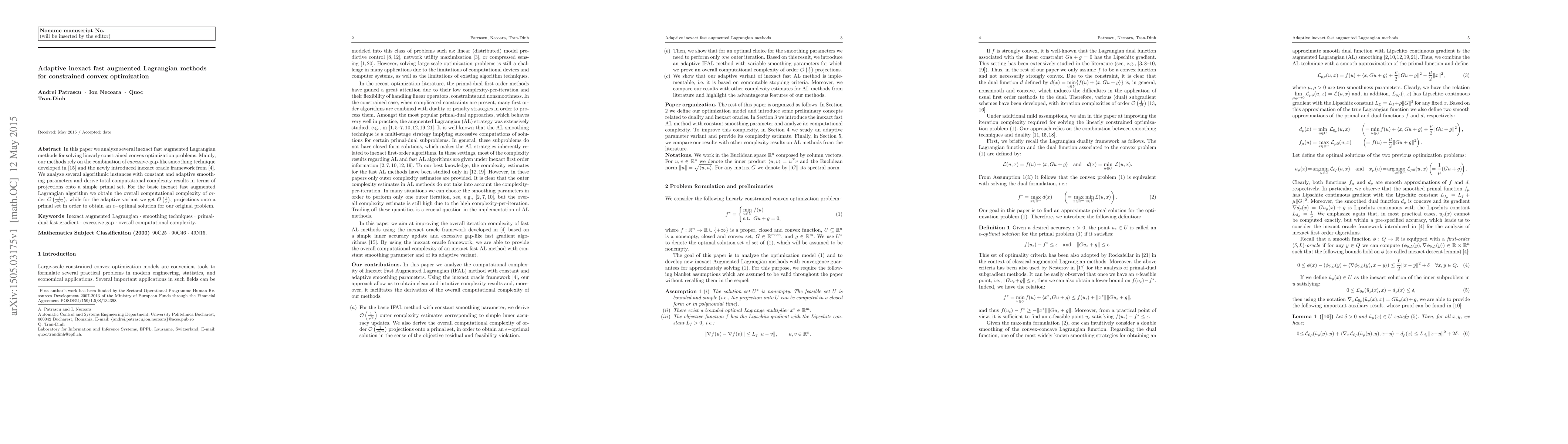 This paper proposes adaptive inexact fast augmented Lagrangian methods for solving linearly constrained convex optimization problems, combining excessive-gap-like smoothing and an inexact oracle framework. The adaptive variant achieves a computational complexity of $\mathcal{O}\left(\frac{1}{\epsilon}\right)$, significantly improving upon the basic method's complexity of $\mathcal{O}\left(\frac{1}{\epsilon^{5/4}}\right)$.