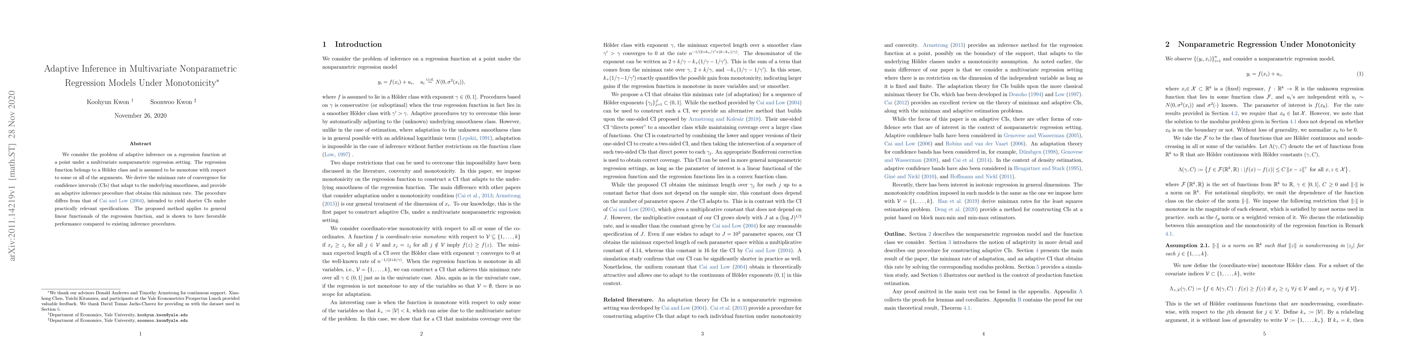 This paper develops an adaptive inference procedure for multivariate nonparametric regression models under monotonicity constraints, achieving the minimax rate of convergence for confidence intervals. The proposed method offers shorter intervals compared to existing approaches and applies to general linear functionals.
