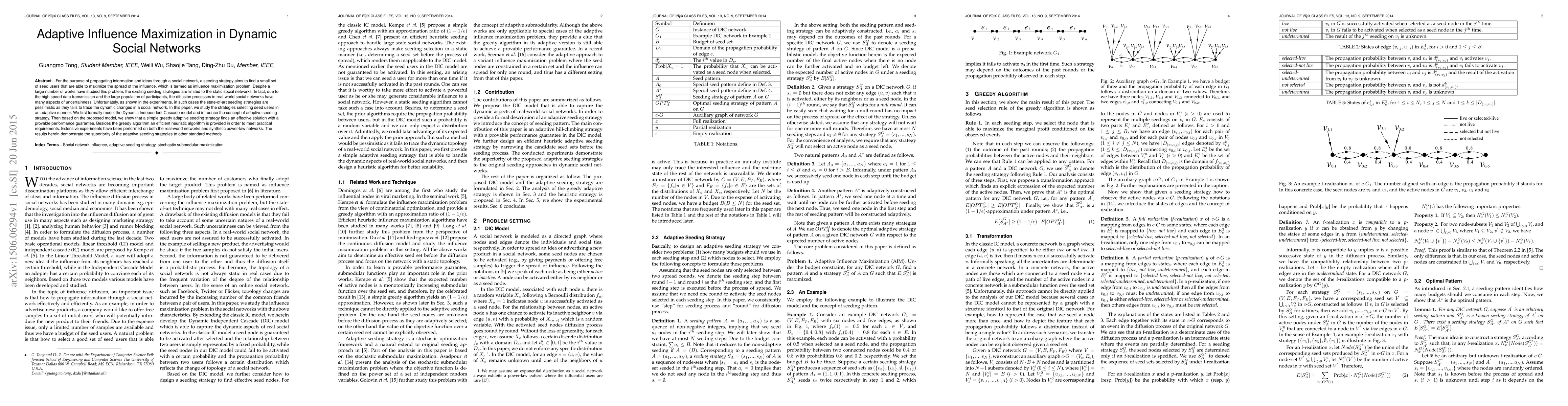 This paper proposes adaptive seeding strategies for influence maximization in dynamic social networks, addressing the limitations of existing static approaches. It introduces a dynamic model and demonstrates that both a greedy adaptive strategy and a heuristic algorithm outperform conventional methods through extensive experiments on real and synthetic networks.