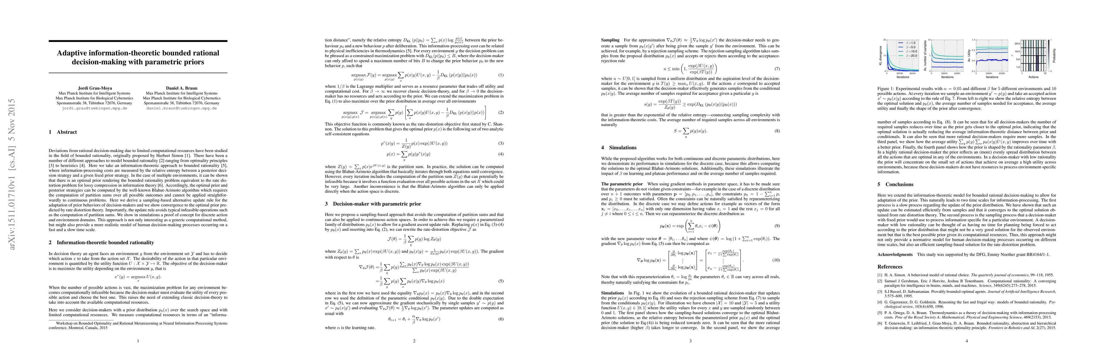 This paper proposes an adaptive information-theoretic approach to bounded rational decision-making under limited computational resources, using parametric priors. It introduces a sampling-based update rule that avoids infeasible computations, enabling convergence to the optimal prior determined by rate distortion theory, validated through simulations in discrete domains.