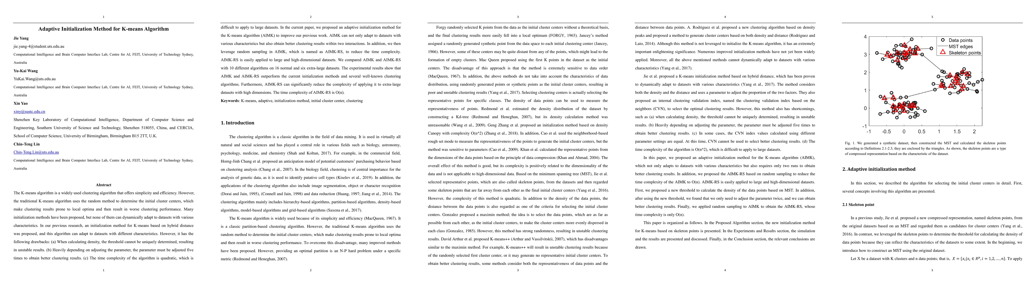 This paper proposes an adaptive initialization method for the K-means algorithm (AIMK) to improve clustering performance by dynamically adapting to various dataset characteristics. AIMK-RS, a variant using random sampling, reduces time complexity to O(n), making it suitable for large datasets. Experimental results show superior performance over 10 other algorithms on both normal and extra-large datasets.