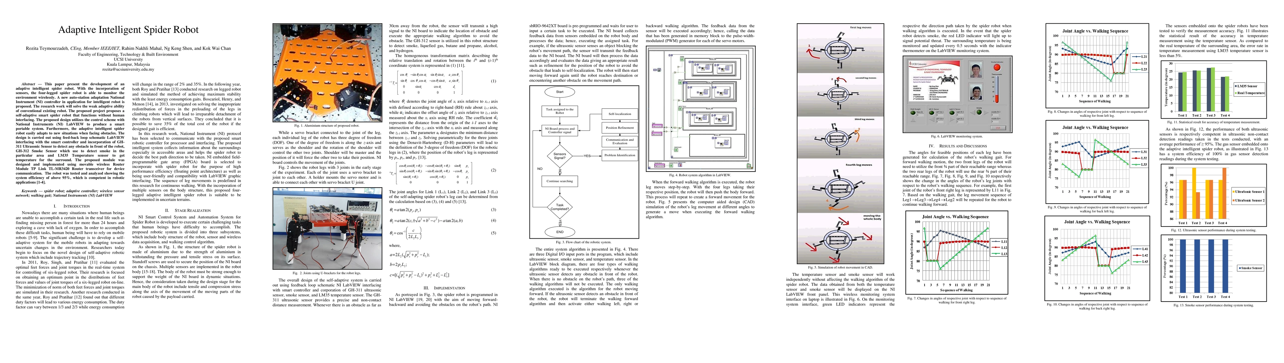 This paper presents the development of an adaptive intelligent spider robot. With the incorporation of sensors, the four-legged spider robot is able to monitor the environment wirelessly. A new auto-station adaptation National Instrument (NI) controller in the application for an intelligent robot is proposed. The research work will solve the weak adaptive ability of conventional existing robot. The proposed project proposes a self-adaptive smart spider robot that functions without human interfacing. The proposed design utilizes the control scheme with National Instruments (NI) LabVIEW to produce a smart portable system. Furthermore, the adaptive intelligent spider robot easily adapts to new situations when facing obstacles. The design is carried out using feedback loop schematic LabVIEW interfacing with the smart controller and incorporation of GH-311 Ultrasonic Sensor to detect any obstacle in front of the robot, GH-312 Smoke Sensor which use to detect smoke in the particular area and LM35 Temperature sensor to get the temperature for the surround. The proposed module was designed and implemented using movable wireless Router Module TP-Link TL-MR3420 Router transceiver for device communication. The robot was tested and analyzed showing the system efficiency of above 95%, which is competent in robotic applications