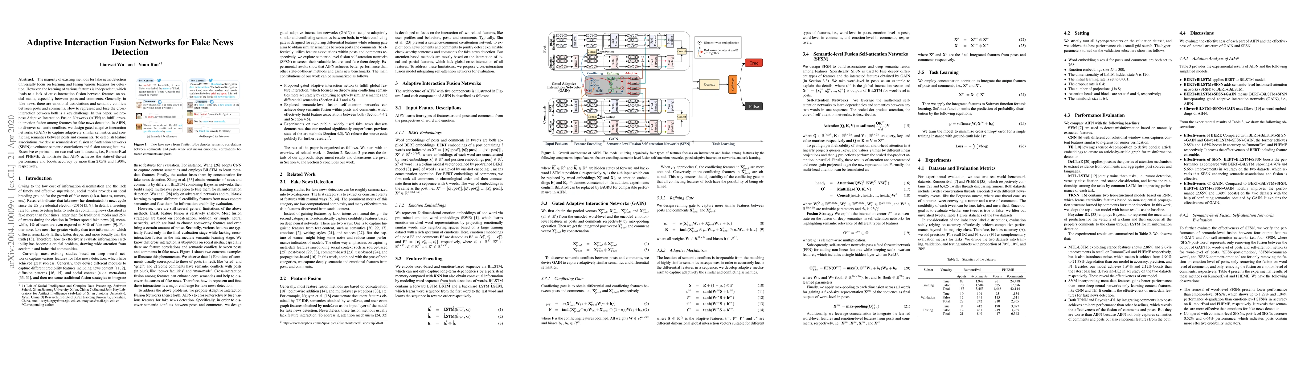 This paper proposes Adaptive Interaction Fusion Networks (AIFN) for detecting fake news by fusing interactions between posts and comments. The method uses gated adaptive interaction networks (GAIN) to capture semantic conflicts and semantic-level fusion self-attention networks (SFSN) to enhance feature associations, achieving state-of-the-art performance on RumourEval and PHEME datasets.
