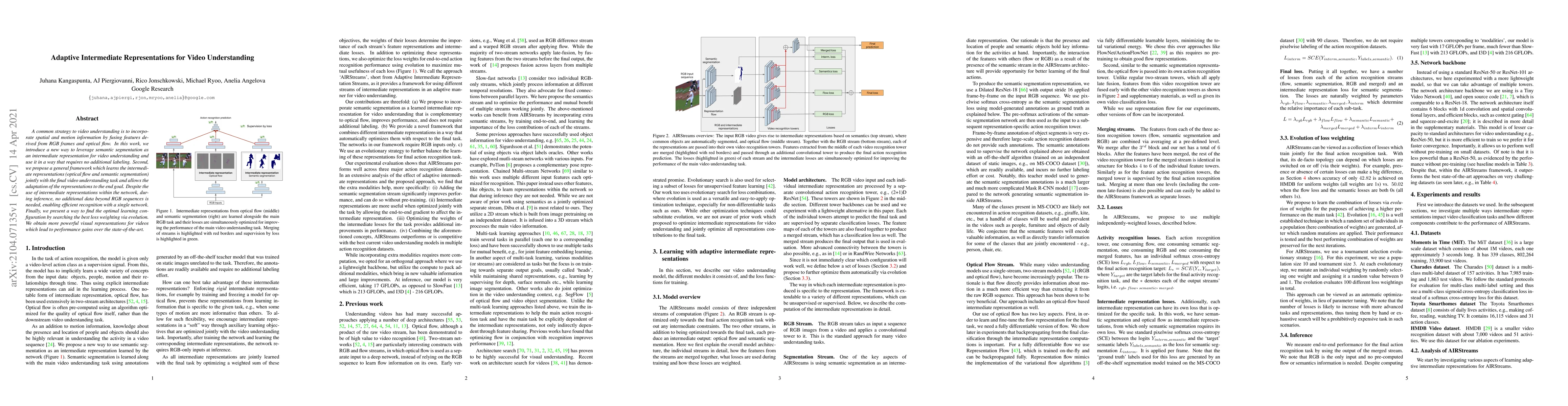 A common strategy to video understanding is to incorporate spatial and motion information by fusing features derived from RGB frames and optical flow. In this work, we introduce a new way to leverage semantic segmentation as an intermediate representation for video understanding and use it in a way that requires no additional labeling. Second, we propose a general framework which learns the intermediate representations (optical flow and semantic segmentation) jointly with the final video understanding task and allows the adaptation of the representations to the end goal. Despite the use of intermediate representations within the network, during inference, no additional data beyond RGB sequences is needed, enabling efficient recognition with a single network. Finally, we present a way to find the optimal learning configuration by searching the best loss weighting via evolution. We obtain more powerful visual representations for videos which lead to performance gains over the state-of-the-art.