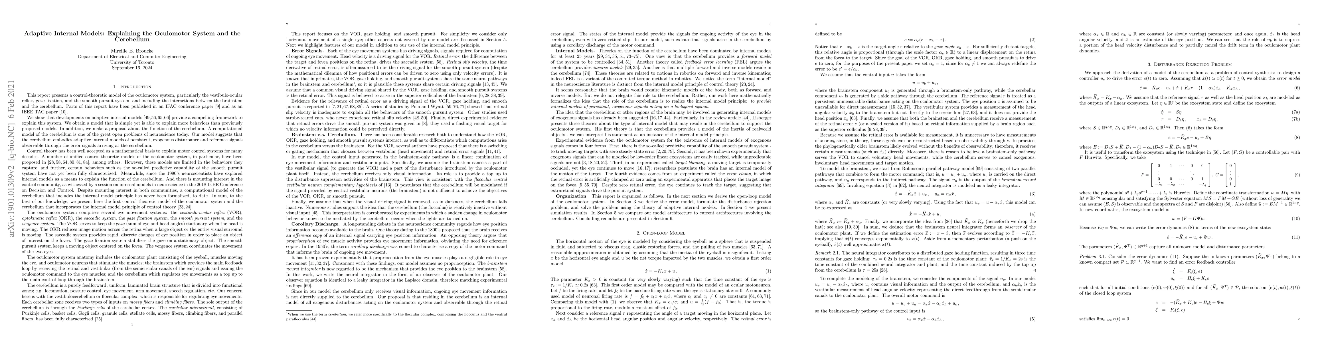 We propose a new model of the oculomotor system, particularly the vestibulo-ocular reflex, gaze fixation, and smooth pursuit. Our key insight is to exploit recent developments on adaptive internal models. The outcome is a simple model that includes the interactions between the brainstem and the cerebellum and that recovers behaviors from more than 15 oculomotor experiments. In addition, we put forward a thesis that the cerebellum embodies internal models of all persistent, exogenous reference and disturbance signals acting on the body and observable through the error signals it receives.